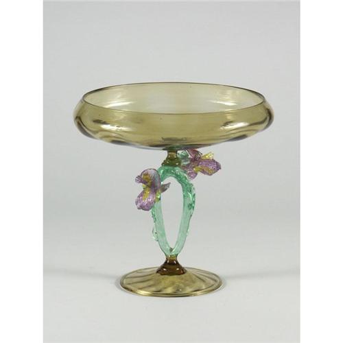 ART GLASS: Venetian style art glass compote, amber glass body and base, hand blown iris flower form stem, 9'' x 9'', unattributed, condition noted.