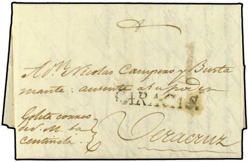 1808 (18 Julio) CARACAS a VERACRUZ. Marca lineal CARACAS, manuscrito "Goleta correo de S.M. La Centinela". A la llegada porte pagado de 1 real. Magnífica y muy rara destinación.