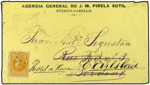 1881 (July 7) Cover from Puerto Cabello to France franked by 1880 25c. yellow orange tied by fine strike of octagonal ´Venezuela/Paq.Fr.A.No.2´. Reverse with Bordeaux arrival (July 25) and forwarded on to Carlsbad. Scarce and fine cover. Scott 71.