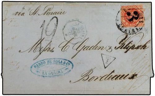 1877 Locally paid letter franked with 1 real vermillion (SG 77), and sent to France by French paquebot service. Stamp cancelled by old ´3´ rate handstamp and CORREOS /LA GUAIRA cds, and front shows octagonal LA GUAIRA French Consular cds in blue, French ´T´ in triangle, plus ´12´ decime postage due handstamp. Reverse bears French LIGNE B/PAQ FR*No 2 datestamp, plus BORDEAUX arrival cds. A scarce and colorful cover with 1988 Holcombe certificate.