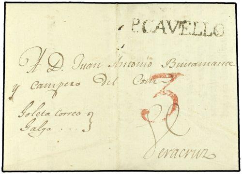 1813 (30 Marzo) PUERTO CABELLO a VERACRUZ. Marca lineal P. CAVELLO en negro, manuscrito "Goleta Correo Galga". Porte pagado a la llegada 3 (reales).