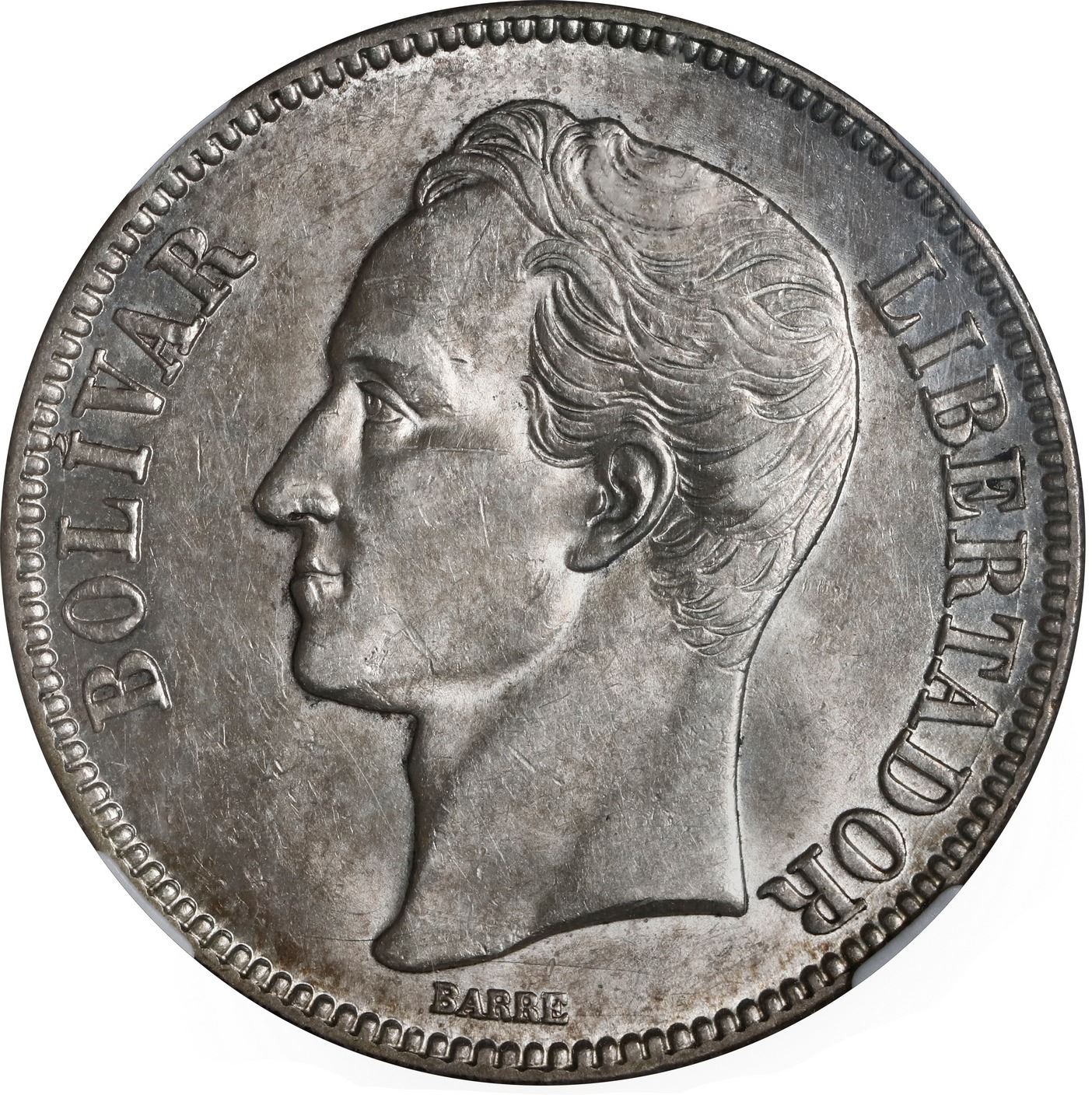 VENEZUELA, struck at the Philadelphia Mint, 5 bolívares, 1929, NGC AU 58.