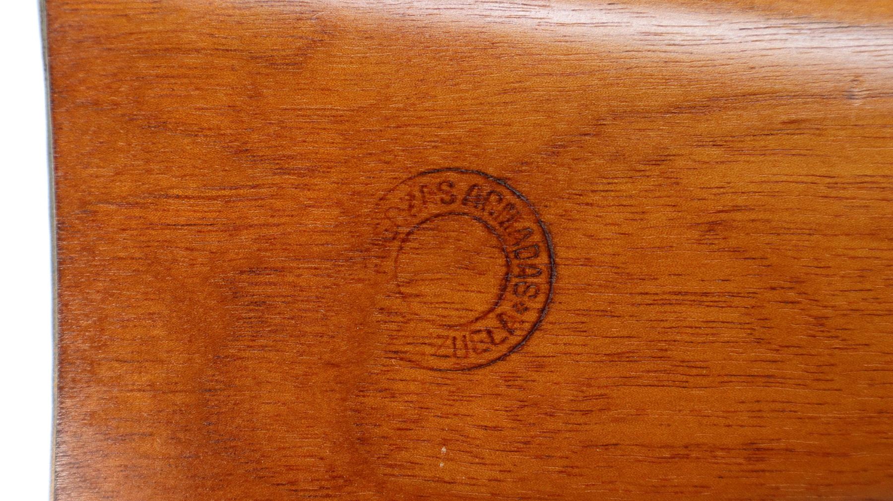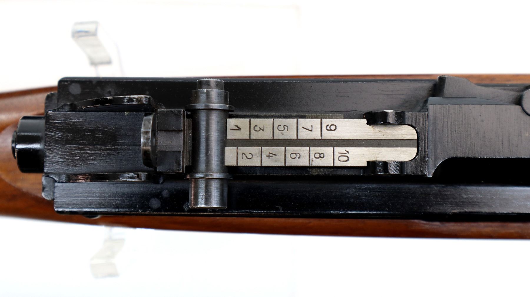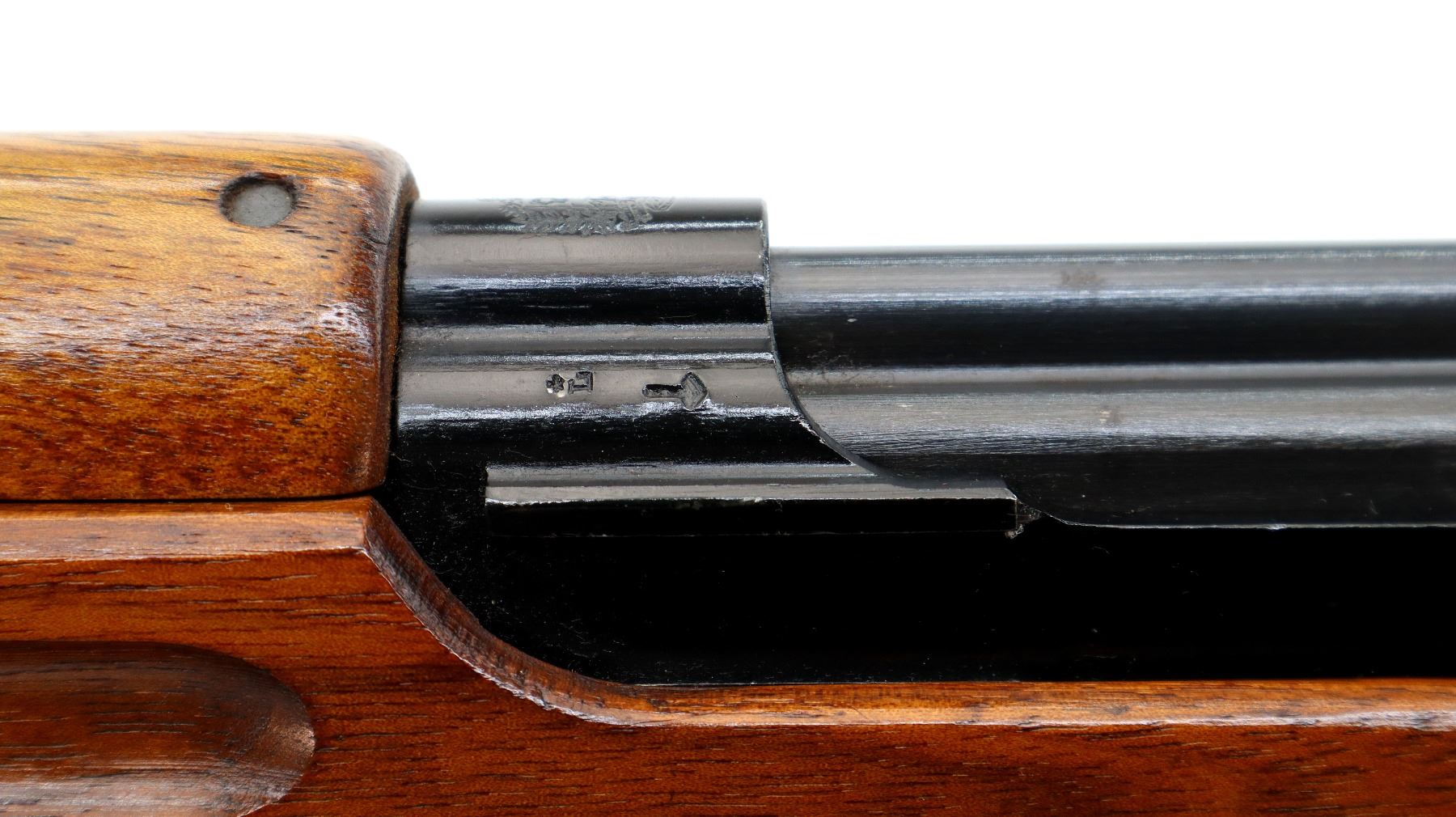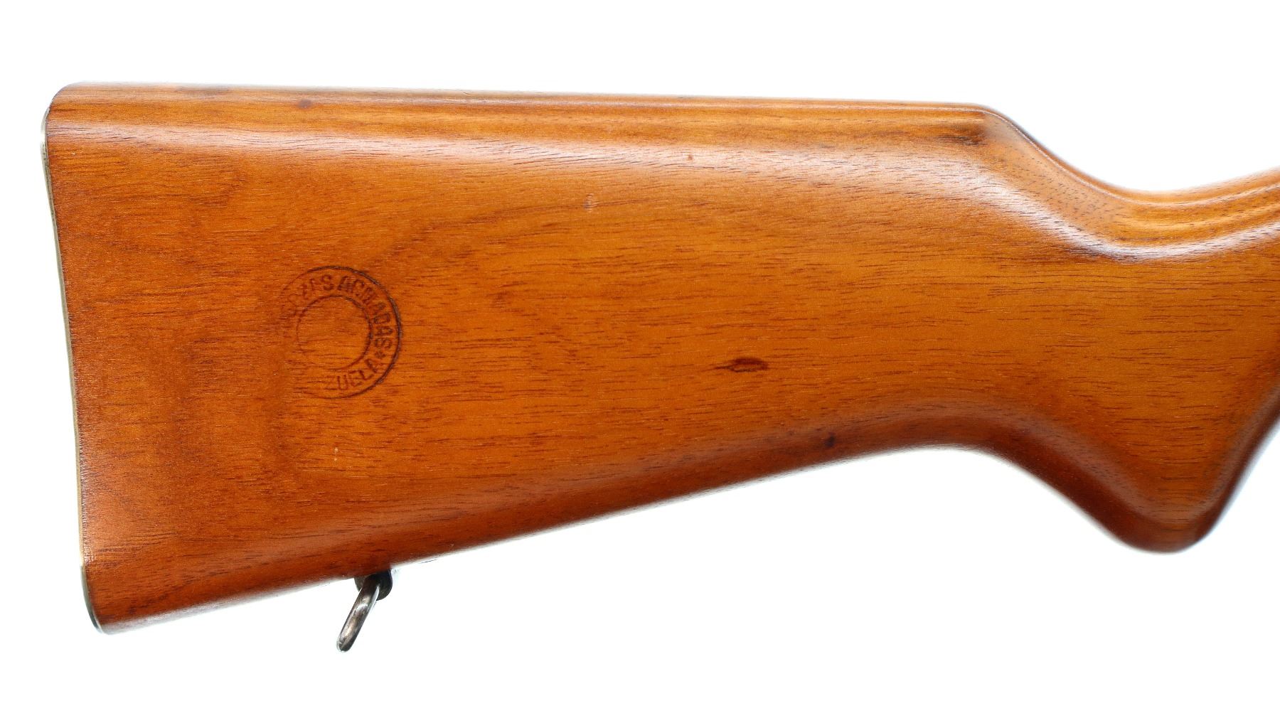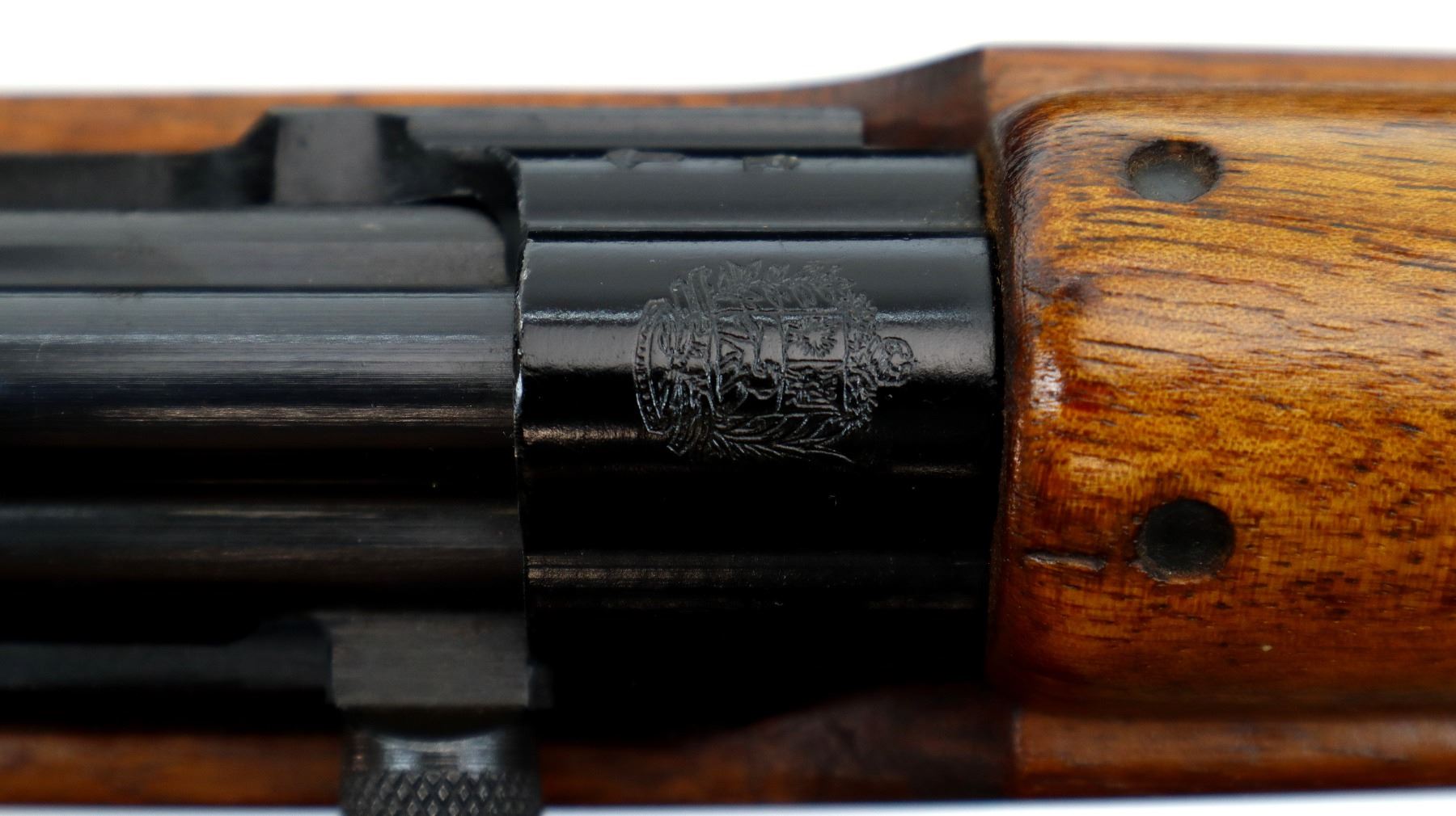 Main Description: Visible serial numbers match. Blade front sight with ears and ramp, adjustable rear peep sight with ears, black painted metal finish, Venezuelan crest on receiver ring, checkered cocking handle. Two piece full military wood stocks, finger grooved forearm, pistol grip, grooved steel butt plate, partial roundel on right side of stock, sling swivels, bayonet lug, attached ported muzzle brake.