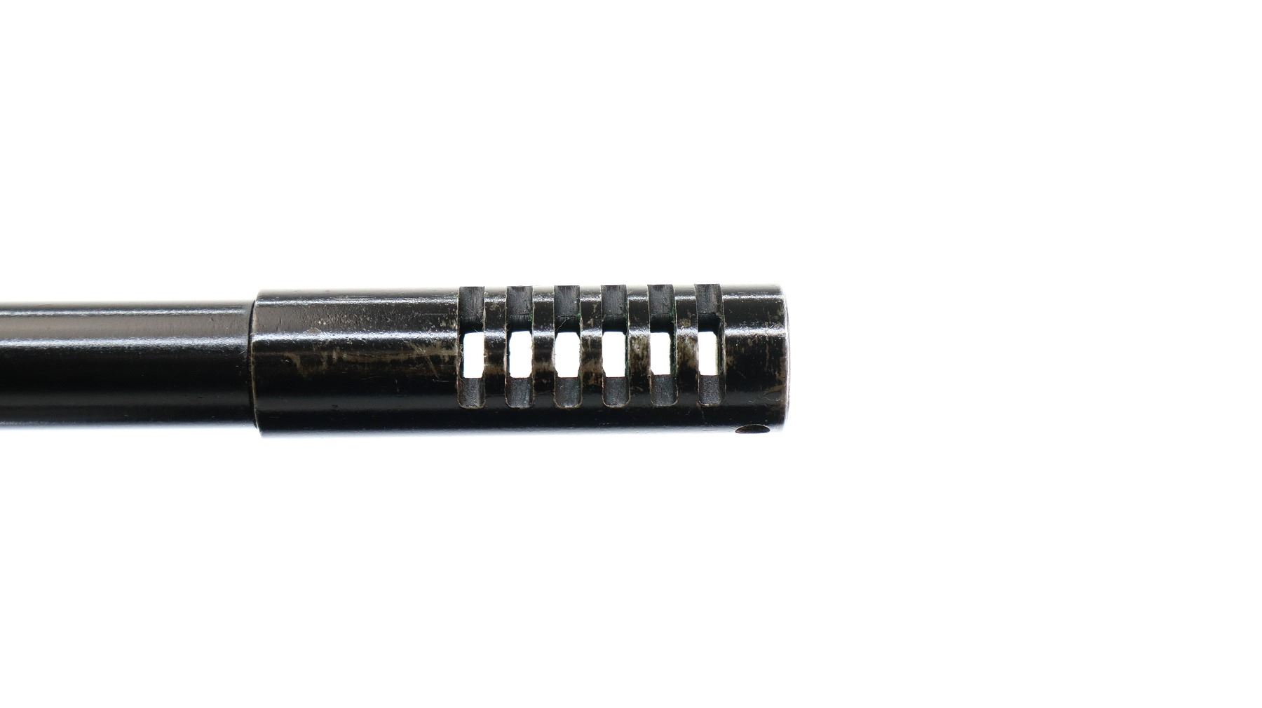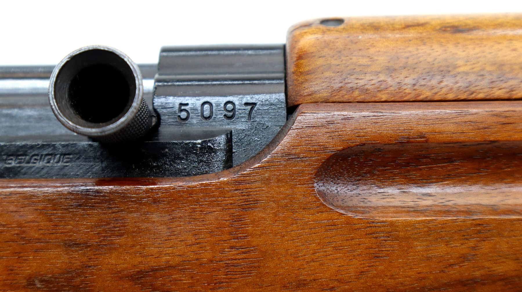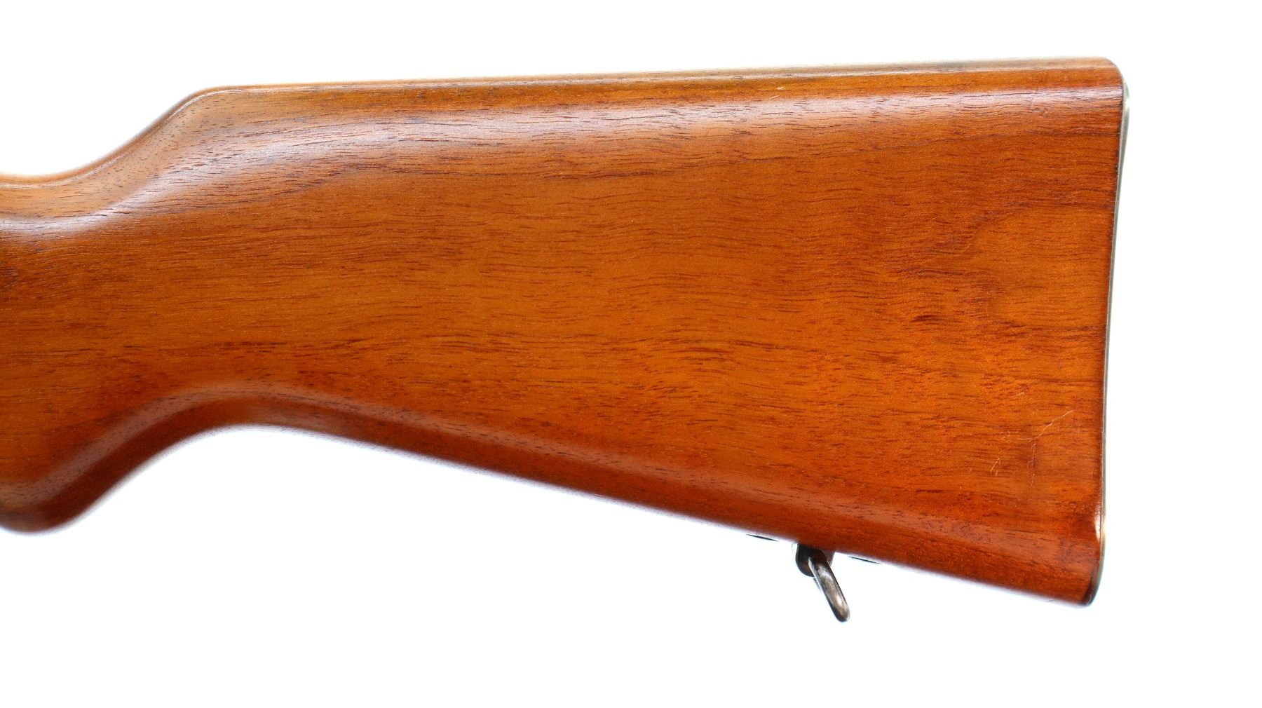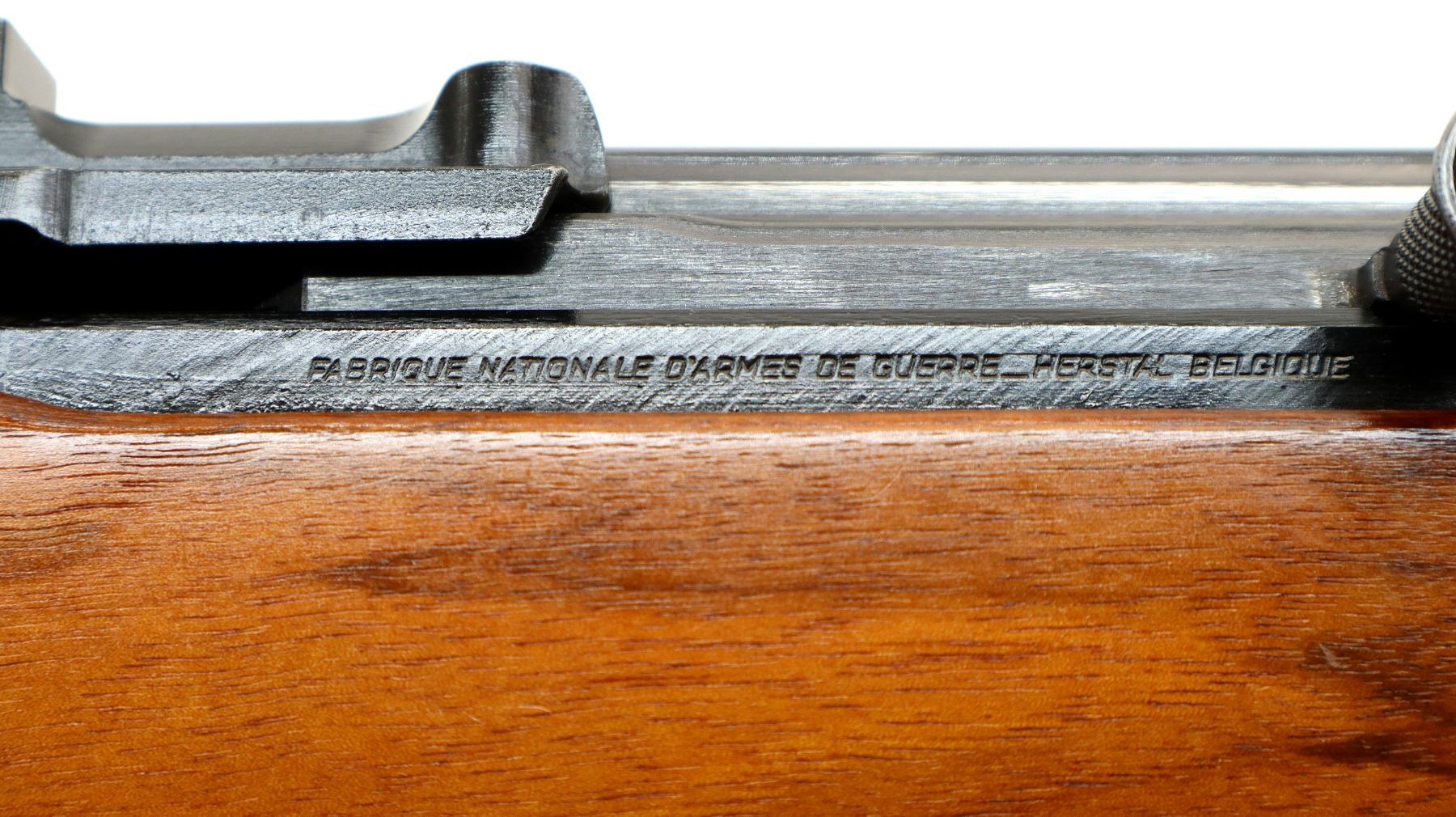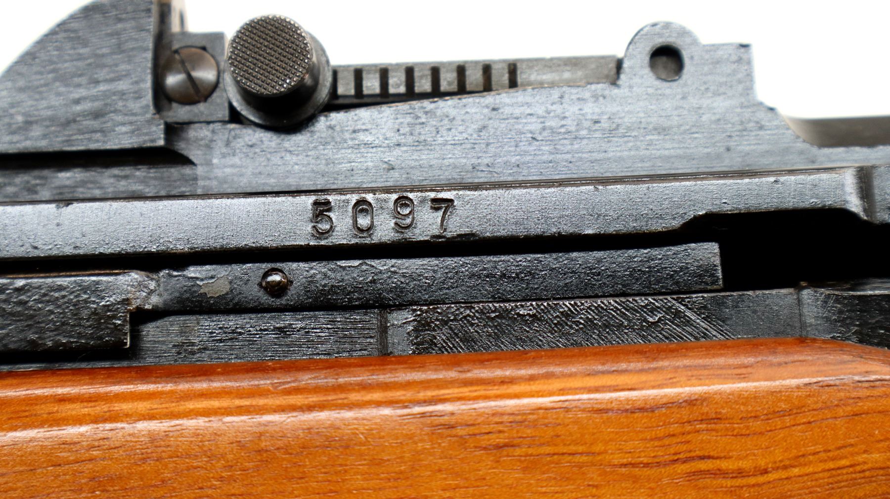 Main Description: Visible serial numbers match. Blade front sight with ears and ramp, adjustable rear peep sight with ears, black painted metal finish, Venezuelan crest on receiver ring, checkered cocking handle. Two piece full military wood stocks, finger grooved forearm, pistol grip, grooved steel butt plate, partial roundel on right side of stock, sling swivels, bayonet lug, attached ported muzzle brake.