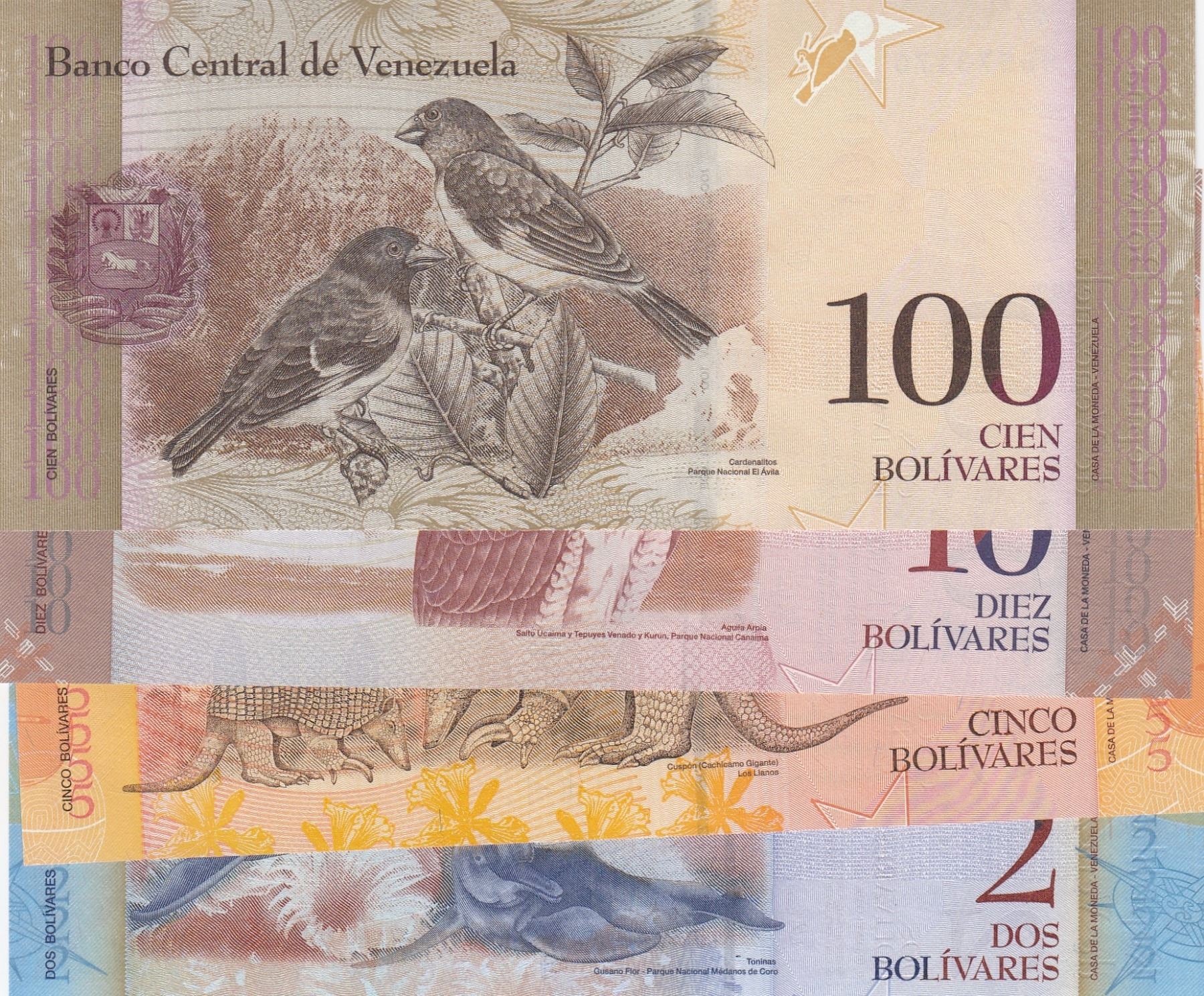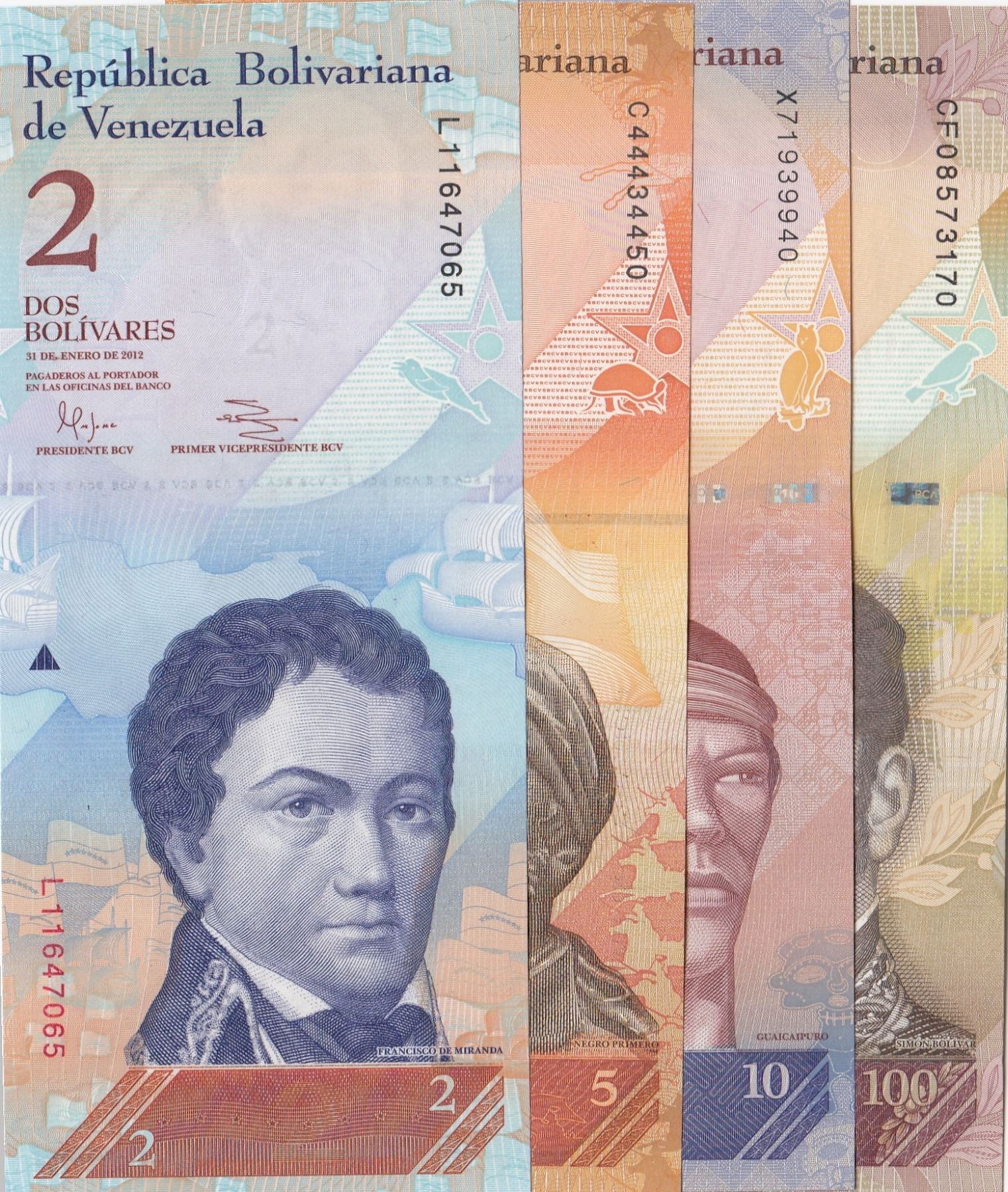 Venezuela, 2 Bolivars, 5 Bolivars, 10 Bolivars and 100 Bolivars, 2012/ 2007/ 2014/ 2015, UNC, p88e/ p89a/ p90e/ p93, (Total 4 Banknotes)
