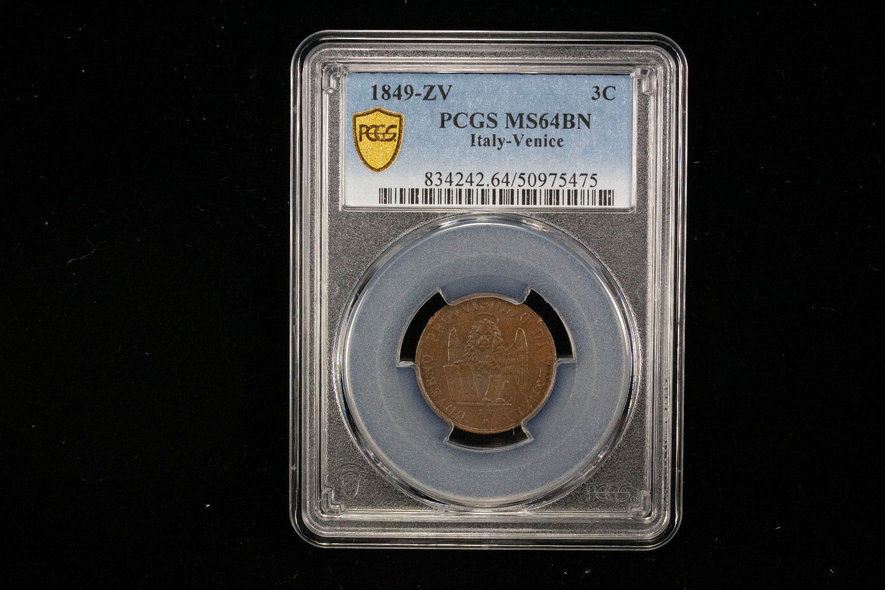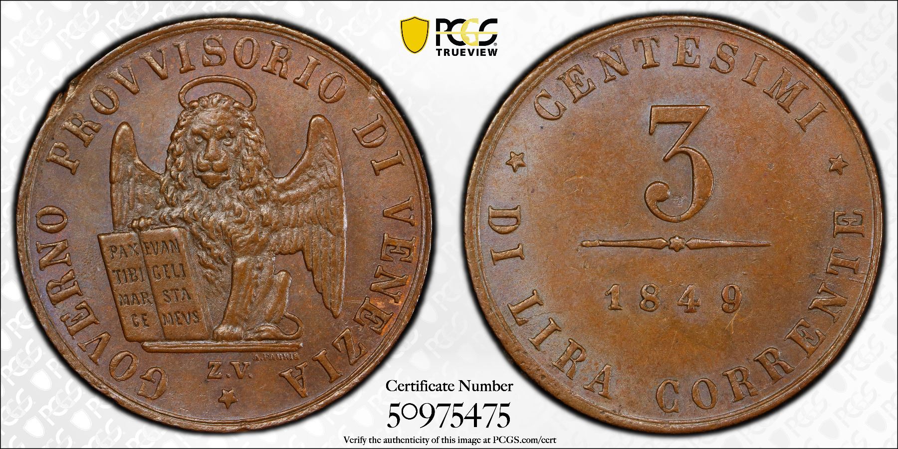 VENICE: Republic, AE 3 centesimi, 1849, KM-808, mint master initials ZV, a wonderful mint state example! PCGS graded MS64 BN. The Republic of San Marco or the Venetian Republic was an Italian revolutionary state which existed for 17 months in 1848–1849.