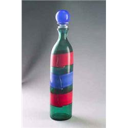 VENINI & C., Murano Fulvio Bianconi Flasche, petrolgrünes Glas mit drei umlaufend aufgelegten Farbbändern in Opak-Rot und Opak-Blau. Hohe zylindrische Form, eingezogene Schulter, kurzer Hals mit ausgestellter Mündung, mit kugeligem Stopfen in Opak-Blau. H.: 38,5 cm. Bez: venini murano ITALIA (dreizeiliger Ätzstempel). Um 1960 Lit.: Deboni, F., Venini, Basel 1990, Abb. 122 (Varianten).