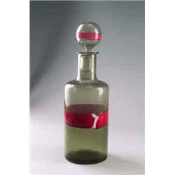 VENINI & C., Murano Fulvio Bianconi Flasche, rauchfarbenes Glas mit umlaufend aufgelegtem Glasband in Opak-Rot. Zylindrische Form mit stark eingezogener Schulter, kurzer zylindrischer Hals und kugeligem Stopfen. H.: 32 cm. Bez.: Firmenetikett. Um 1960 Lit.: Deboni, F., Venini, Basel 1990, Abb. 122 (Varianten) - Heiremans, M., Glas-Kunst aus Murano, 1910-1970, Stuttgart 1993, Abb. 7, S. 349. (zum Firmenetikett)