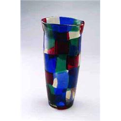 VENINI & C., Murano Fulvio Bianconi Vase Pezzato, blaues, rotes, grünes und rauchfarbenes Glas in Patchwork-Technik aufgeschmolzen. Fast zylindrische Gefäßwand, im oberen Bereich schwach eingedrückt, Mündung leicht ausgezogen, mit unregelmäßig gewelltem Rand. H.: 22,5 cm. Bez.: venini murano ITALIA (dreizeilig geätzt). 1950er Jahre Lit.: Gli Artisti di Venini per una Storia del vetro d´arte veneziano, Ausstellungskat. Istituto di Storia dell´Arte Venedig 1996, Abb. 145-147, S.118 (Form- und Dekorvarianten).