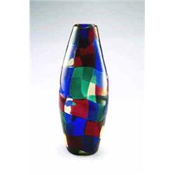 VENINI & C., Murano Fulvio Bianconi Vase Pezzato, rotes, blaues, grünes und gelbes Glas in Patchwork-Technik aufgeschmolzen. Hohe, schlanke, bauchige Form; partiell eingedrückt. Werkseitig beschliffene Luftblase. H.: 27,5 cm. Bez.: Venini italia (zweizeilig graviert). Mit Firmenetikett. 1964-1974 Lit.: Barovier, Marina/ Barovier Mentasti, Rosa/ Dorigato, Attilia, Il vetro di Murano alle Biennali 1895-1972, Milano 1995, Abb. 104, S. 171.