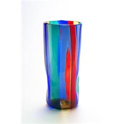 bernsteinfarbenes, blaues, rotes und grünes Glas. Vertikale Bandglasstäbe in alternierender Farbanordnung als Gefäßwand ausgearbeitet. Zylindrische Form, im unteren Drittel mehrfach leicht eingedrückt, unregelmäßige Mündung. Äu. min. Kratzer. H.: 23,5 cm. Bez.: Firmenmarke venini murano ITALIA (dreizeilig geätzt), altes Firmenklebeetikett. Um 1948