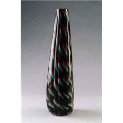 VENINI & C., Murano James Carpenter Vase Calabash, dunkelviolettes Glas mit aufgeschmolzenen Glasstücken in Grün und Rot. Dreiseitige, konische Form. H.: 33 cm. Bez.: venini murano italia (einzeilig diamantgeritzt). 1980 Lit.: Venetian Glass: 20th. Century Venetian Glass. The Nancy Olnick and Giorgio Spanu Collection. Ausst.kat. The American Craft Museum New York 2000, Abb. 149, S. 182.