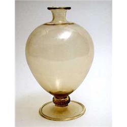 bernsteinfarbenes Glas. Tellerfuß mit geripptem Nodus, ballonartiger Korpus mit stark eingezogener Schulter, kurzer schmaler, röhrenförmiger Hals, ausgezogene Mündungslippe. H.: 24,2 cm. Unter dem Stand bez.: venini murano ITALIA. 1950er Jahre