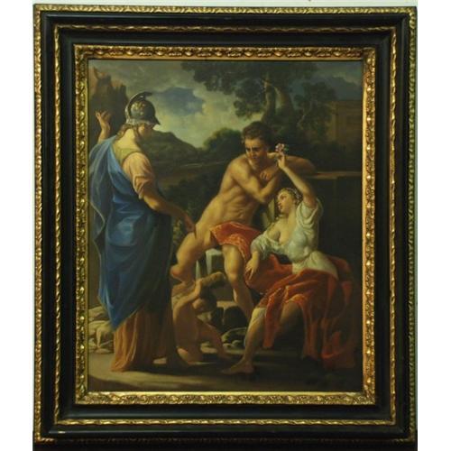 DESCRIPTION: VENUS TEACHER OF LOVE. Who could very well speak of love and charm by her gestures and her works was certainly Venus, the goddess of love. We can see her in this framework with an expression between the dreamy and satisfied: she presents a rose to Adonis and at the same time, look at Mars, god of the war. Venus was a capricious goddess and she arranged many troubles to mortals arousing or dissolving constraints passions and love. But her malicious son Love (Eros), threw one of his arrows and let her fall in love of Adonis: a young and beautiful hunter, whose premature death (murdered by Mars, jealous for the real love between Venus and Adonis), plunged the love goddess into despair.