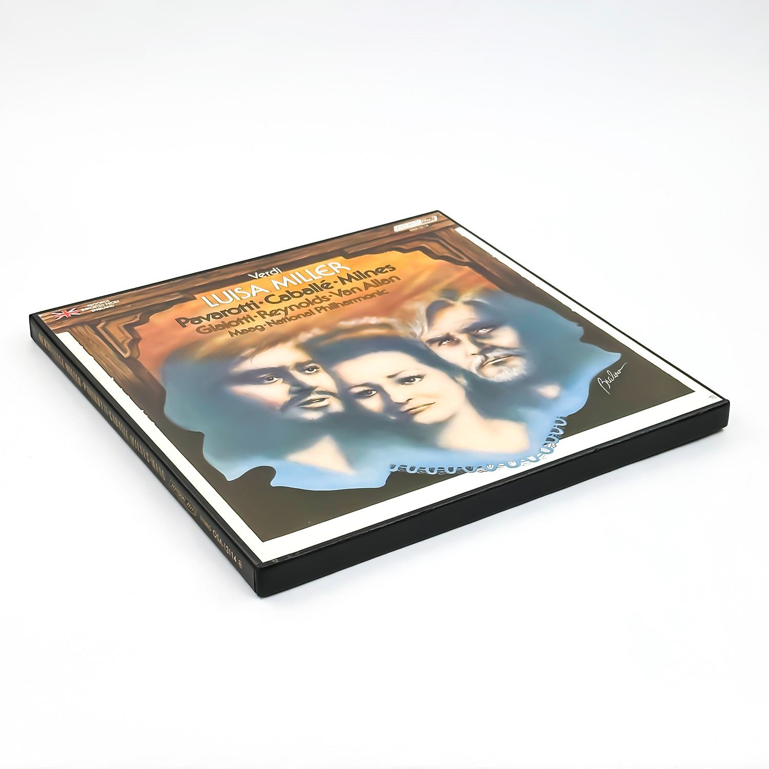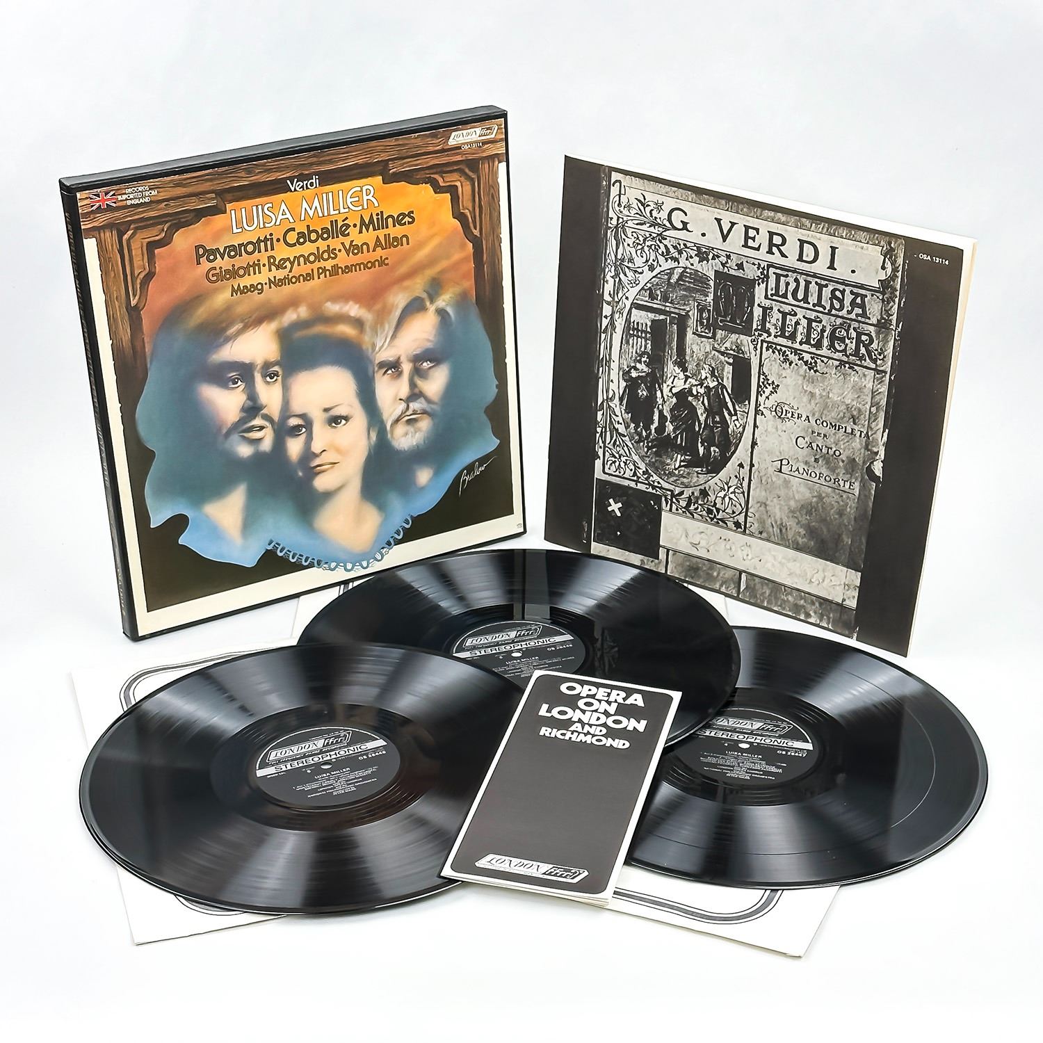 #9585 - 3X VINYL LP BOX SET & INFORMATIONAL INSERT. RECORD ALBUM FROM PRIVATE COLLECTION OF CLASSICAL/OPERA RECORDS. CLASSICAL, OPERA, ROMANTIC. VERDI LUISA MILLER - PAVAROTTI, CABALLE, MILNES, GIAIOTTI, REYNOLDS, VAN ALLAN, MAAG. NATIONAL PHILHARMONIC ORCHESTRA. LONDON RECORDS OSA 13114