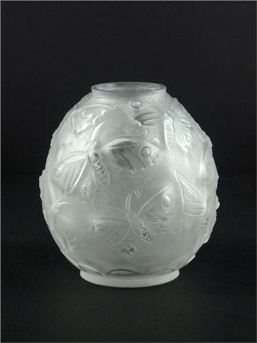 ART GLASS: Signed Verlys frosted glass tulip vase having raised butterfly/moth decoration. Mid-20th c. Approx. 5'' H