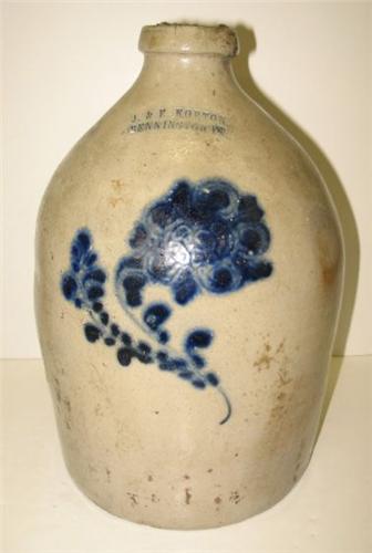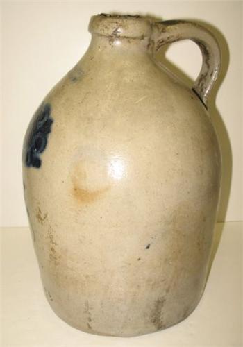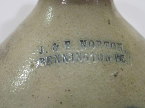 BLUE DECORATED HANDLED STONEWARE JUG. Cobalt blue slip decorated with floral design. Stamped at top “J. & E. Norton-Bennington, VT.” Jug is in excellent condition with only firing cracks at underside and one small chip near bottom. Jug opening is lined with tobacco spit. 11.25” H