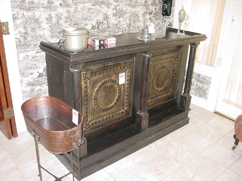 VERONA BAR IN COFFEE FINISH WOODEN BAR WITH ENCLOSED STORAGE, AND OLD METAL CEILING TINS ON FRONT