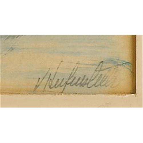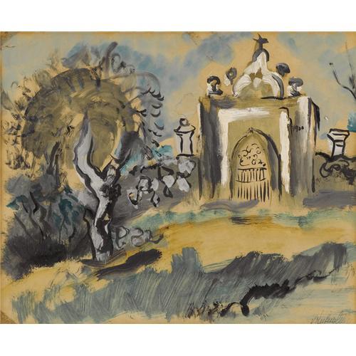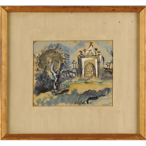 <B>VERONICA HELFENSTELLER (1910-1964)</B></I><BR>Untitled Crypt, 1940s<BR>Gouache<BR>9in. x 11in.<BR>Signed lower right<BR><BR>Southwestern artists have always had a fascination for Mexican missions, churches, and graveyards.<BR><BR>This gouache is inscribed verso: <I>To Mary and David - Veronica.</B></I><BR><BR>Provenance:<BR>Acquired from the artist<BR>Fort Worth Estate<BR><BR> <B>Condition Report:</B> Mat burn along bottom margin. Period frame in good condition.<BR><BR><b>Shipping:</b> Requires 3rd Party Shipping (<a target="_blank" href="http://www.heritageauctions.com/common/shipping.php">view shipping information</a>)