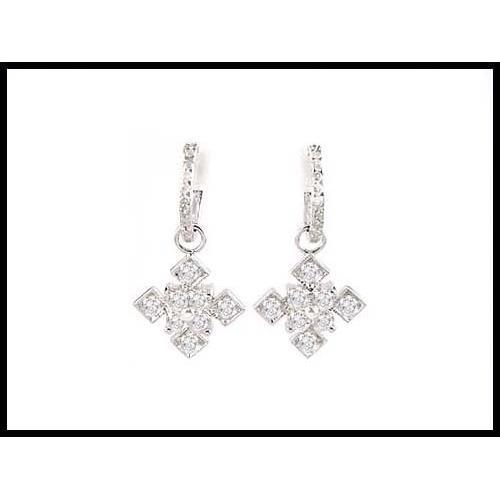 You may wear these stunning earrings with, or without the hanging pendants. 18K white gold and 32 diamonds (.90 carats) create high elegance and unique design. The diamond dangle part measures 10mm (3/8") wide x 10mm (3/8") long, and the whole earring 27mm long (1 1/16") long. Expect to pay your local jeweler between $1,100.00 to $1.200.00, but own these for a small fraction of that.