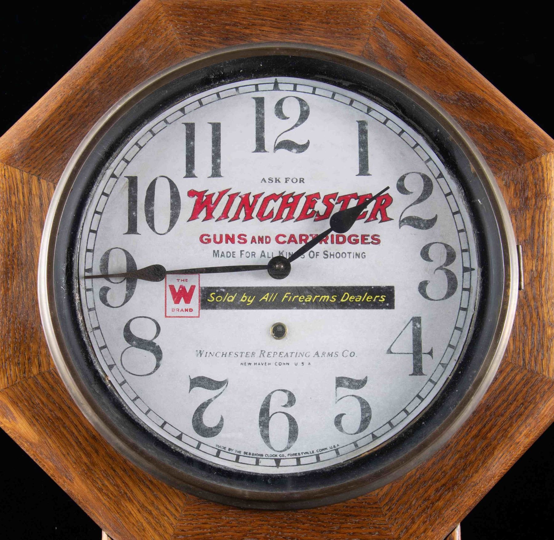 WINCHESTER ADVERTISING REGULATOR WALL CLOCK. Clinton Regulator clock mfg. by the Sessions Clock Company in Forestville, Connecticut circa. 1920. The clock face is marked "ASK FOR" above the Winchester trademark logo and "GUNS AND CARTRIDGES/ MADE FOR ALL KINDS OF SHOOTING", with a boxed "W/ BRAND", followed by a boxed "Sold by All Firearms Dealers" above "WINCHESTER REPEATING ARMS Co./ NEW HAVEN CONN USA". Bottom of face border is marked "MADE BY THE SESSIONS CLOCK CO. FORESTVILLE. CONN. U.S.A.". Clock body is comprised of oak, measuring 28" from top to bottom and 17" wide, with the face measuring 12" in diameter. Glass pendulum door pane exhibits reverse painted decorative double gold borders, with a red stylized Winchester "W" embellishment present at the center of the pane. Pendulum is covered with an attractive brass plate, featuring decorative foliate motifs. Clock is accompanied by a period brass key. Consignor states that the movement has recently been serviced, and will give decades of trouble free service. Remnants of label remains on reverse. Clock body is very good to excellent overall. Brass housing exhibits a pleasing mellow patina. Double borders and stylized "W" on pendulum door, but are otherwise very good overall. An extremely attractive Sessions Clock Company Clinton Winchester advertising clock with a recently serviced movement, that will make for an fine and functional addition to one's collection. (02-24008/KAT). $1,500-2,000.
