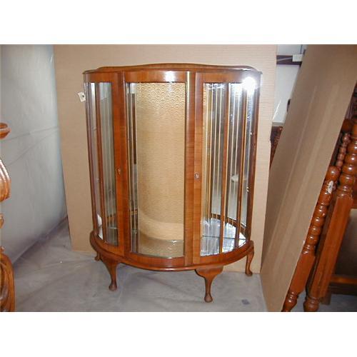 This is a beautiful china cabinet with glass sides and doors and mirrors on the inside. The cabinet has two shelves inside and has a nice curve inside of the cabinet. In the middle inside the back is lined with veneer, a little bit of the top corner is chipped, but this is a very beautiful cabinet. Has nice curved legs; it is from Barget, London, there is a label on the back. Measurements: 46 ½? tall, Side-Side 38 ½?, Front-Back 16?. Weight unknown.