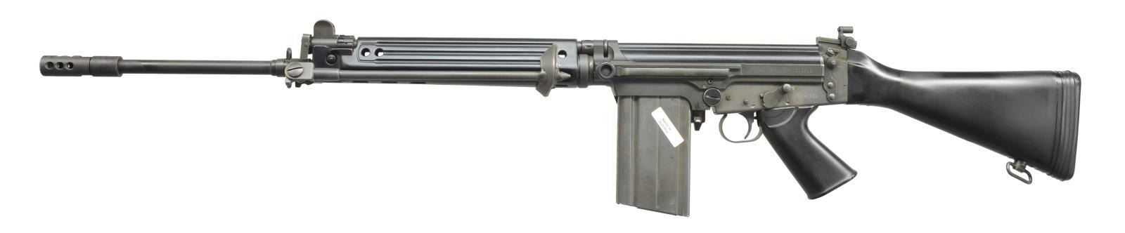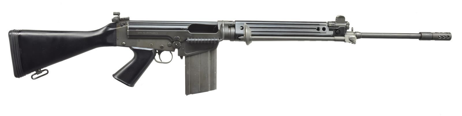 Cal. 308. S# DS12413. Bbl. 21". A classic configuration SA58 from DS Arms. Bbl. terminated w/ threaded muzzle & brake. Standard profile bbl. w/ sling swivel & bipod which folds tightly against metal handguard. Fully adj. gas system. Left side, non reciprocating changing handle. Right side folding carry handle. Elevation adj. protected post front sight. Slide adj. rear peep sight marked from 200-600m w/ target insert. Metric pattern receiver. Correct black plastic shoulder stock w/ soft rubber factory recoil pad. MAGS: 2 metal 20 rd. CONDITION: finish on exposed metal surfaces are complete & consistent w/ very little blemishing. Top cover ejection port demonstrates very little use. Areas of normal wear such as the mechanical intersection between bipod, feet & handguard are almost unblemished as firearm has been stored w/ a thin cloth material between them for finish preservation. Bore is shiny w/ strong rifling & fire control mechanism appears to function correctly when cycled by hand. (21-1685/JZ). MODERN. $900-1,400.