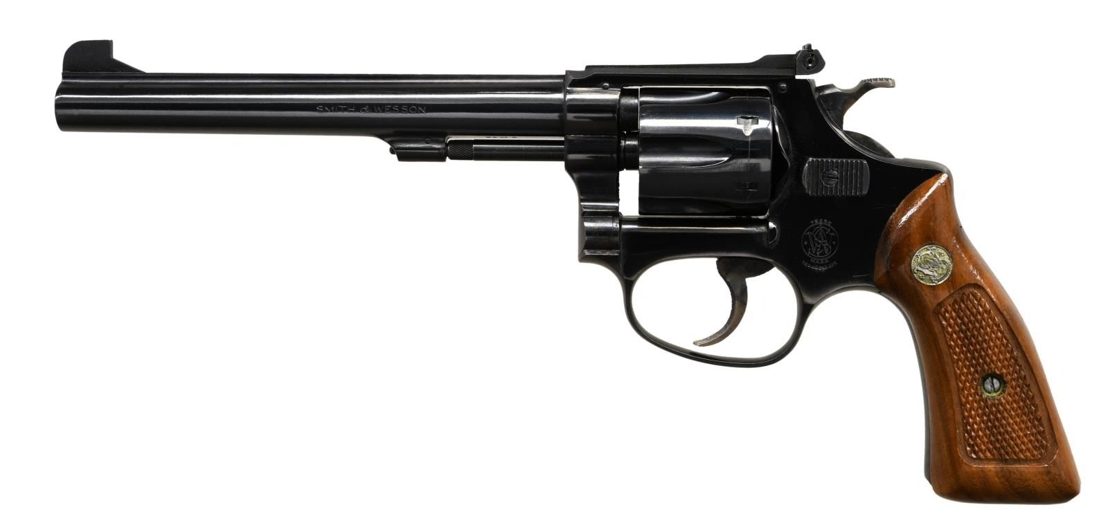 Cal. 22LR. S# 23612. Bbl. 6". Mfg. 1953-1969. Double action revolver built on improved I Frame w/ 3 screws. 6 shot fluted, counterbored cylinder. 6" serrated ribbed & pinned barrel. 1/10" Patridge front & black micrometer click adjustable rear sights. Serrated flat latch cylinder release. Matching numbers on frame, cylinder, ejector & barrel. Smooth front strap & backstrap. .350" checkered hammer. Serrated trigger. S&W logo on left side of frame. Left side of barrel marked; "SMITH & WESSON" and marked "22 LONG RIFLE CTG" on right side. Checkered walnut grips w/ S&W medallions. CONDITION: Blued finish complete & consistent w/ only slight signs of prior use. some very gentle thinning at muzzle. Light drag line on cylinder. Timing appears correct. Bright bore w/ strong rifling. (23-2408/JZ).CURIO. $500-800.