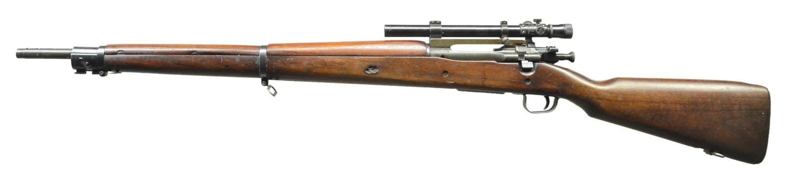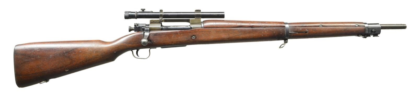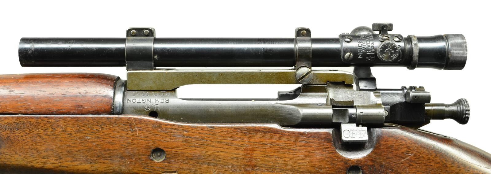 1903 A-4 BOLT ACTION SNIPER RIFLE W/ MODEL 330 WEAVER TELESCOPIC SIGHT. Cal. 30-06. Ser. #4997429. Bbl. 24". Bbl. is marked behind sight cuts "RA" "flaming bomb" & "1-44". Receiver has correct offset markings & has been fitted w/ Redfield one piece scope base & Weaver Model 330 scope w/ crosshair reticle. Front sight was not fitted leaving the Parkerized finish intact which was correct for these rifles. Bbl. is marked "RA" "flaming bomb" "1-44". Bolt has correct turned down handle. All visible bolt markings are "R". Cutoff is marked "R". Scope base has Parkerized finish & is marked "REDFIELD at right rear. Blued steel rings. Scope tube is marked "MODEL 330" "PATS. PEND." "W.R. WEAVER CO." "EL PASO, TEX, U.S." Scope is marked on right rear w/ electro-pencil "TELESCOPE M73 B1" "SERIAL NO. 8532". Walnut stock set w/ scant grip & 2 recoil bolts. Stock is marked on left side w/ "RA" & "FJA". All stamped furniture including lg. bow trigger guard & checkered trap buttplate. Marked under forend w/ assembly numbers "A 129 5". CONDITION: stock set has very lg. degree of original finish but w/ light wear, staining & scattered handling marks. Notable semi-circular marks on left side of buttstock likely from ordnance holding fixture. 2 open knots on left side; one over trigger guard retains part of filler, the second, midway of the forend, has no remaining filler & measures approx. 3/4" x 3/8". Metal has lg. degree of original Parkerized finish w/ light wear & scattered scratches notable at forward end of bbl. Furniture has worn blue original finish w/ scattered spots of light oxidation. Scope tube & rings have thinning original finish. Scope optics appear to be slightly cloudy but serviceable. Near excellent shiny bore. (22-4136/RW) CURIO. $3,000-4,000.