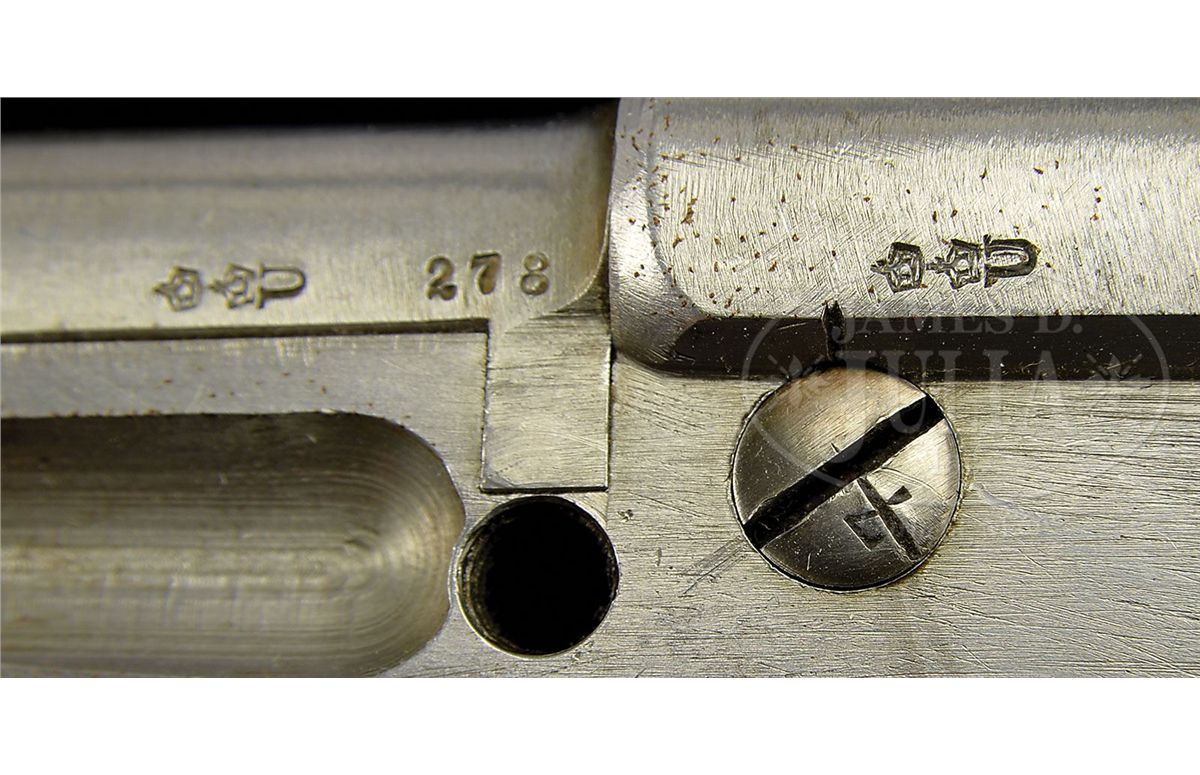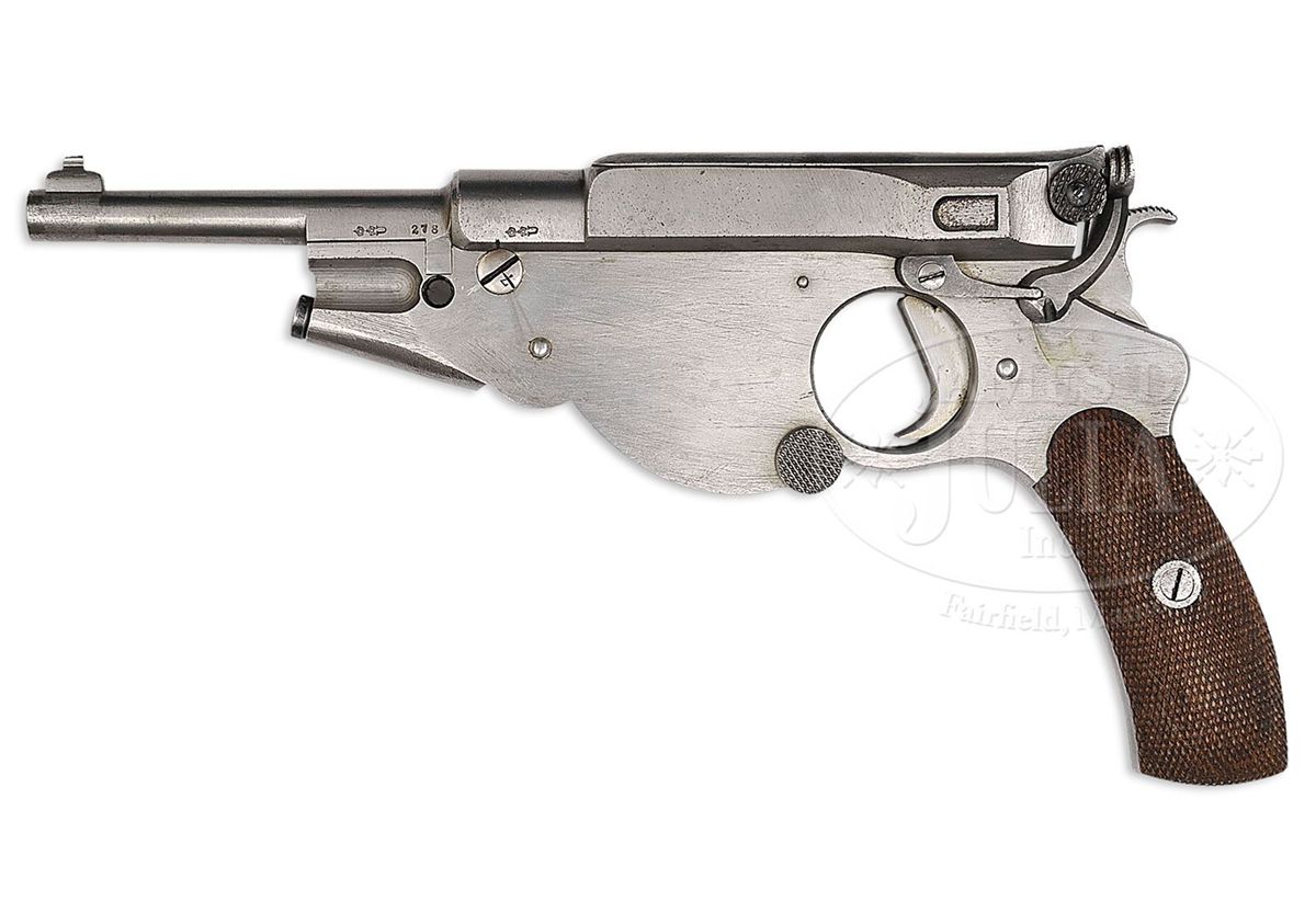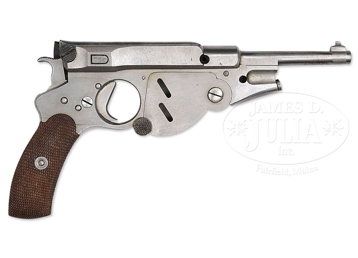 SN 46. Caliber 6.5mm Bergmann. This is a prototype M1896 #3 semiautomatic pistol as produced by the Bergmann company with no extractor and narrow grip. Chambered for the 6.5mm Bergmann grooveless rimless cartridge. Theodor Bergman was an early pioneer in the development of European semiautomatic pistols in the late 1890s and early 1900s. His early models were of distinctive design and had a silhouette that would never be confused with a competitor. All of the Number 2s, 3s, and 4s, had an integral magazine that was loaded by rotating down the magazine sideplate and inserting a strip of cartridges from the side. This particular pistol has a 4.5" bbl, a dovetailed front sight and a fixed rear sight integral to the bolt that is affixed to a sliding cover over the ejection port. The lugged bbl is marked 278 on the left side. Adjacent to this number is the Crown U marking that is repeated on the left side of the chamber. The left receiver, with short flutes, is otherwise unmarked. The serial number 46, lightly marked for internal identification, was placed on the left side of the frame under the grip. Though the pistol was proofed, as reflected by the Crown U markings, it is otherwise roughly finished, without any factory markings, and in the white. There is a 3/8" diameter threaded hole in the forward frame just below the bbl lug, significance unknown. The trigger in this pistol is differently contoured than other #3s, being thicker and straighter near the pivot point. There is no lanyard loop at the base of the grip. Walnut grips are finely checkered without a border and without a logo, each internally numbered 278. PROVENANCE: R. Alexander Montgomery Collection. Joseph J. Schroeder, Jr. Collection. CONDITION: Given the age of the pistol, the brightness of the metal is extraordinary. There has been no effort to enhance any of the surfaces that are still rife with machine marks and rough filing. Only minor pin prick oxidation is on the left side of the gun. In keeping with its toolroom status, all small parts are roughly finished and in the white. Crisply checkered grips showing minimal handling. Bright mirror bore with sharp rifling. Formerly in the collection of R. Alexander Montgomery. Mechanically perfect. 4-48516 LMA57