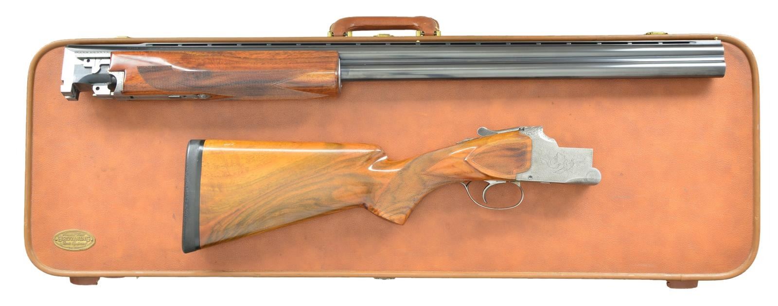 WITH CUSTOM STOCKS & 20 GAUGE BRILEY TUBES. Cal. 12 Ga., 2 3/4". S# 2004 (1932). Bbls. 30" fitted with interchangeable choke tubes also have slightly raised ventilated rib, rear portion marked "Browning Superposed". "MADE IN BELGIUM", patent numbers and FN info are on right side of top bbl. Left is marked "BROWNING ARMS COMPANY OGDEN UTAH" and "12 Ga. Special Steel". Coin finished superposed action is fitted with miller single selective trigger, selector is in safety button. Action is engraved with near full coverage rose and scroll on bottom; on sides, a pair of pigeons fly through a field of scroll. After the war; guns of this pattern become the "pigeon" grade. Top fence is deep relief carved with acorns and oak leaves. No engraver's signature is found. Custom pistol grip buttstock of nicely figured American walnut measures 13 7/8" over black "Old English" pad. Sidepanels are checkered and point pattern checkering is on grip. Matching slightly flared beavertail forend has usual Browning latch. MEASUREMENTS: STOCK: DAH: 1 11/16". DAC: 1 1/4+". LOP: 13 7/8". CAST: neutral. WEIGHT: 7 lb. 14 oz. UNATTACHED ACCESSORIES: gun comes with tan Hartman case marked "Browning" which is lined in faun faux fur and contains 20 ga. Briley tubeset with interchangable choketubes, 4 chokes for 12 ga. bbls. (2 in gun for total of 6) and rapid installation tool. CONDITION: good as refurbished. Bbls. with nearly all of an old reblack Action cleaned to coin finish. Engraving remains good. Custom stocks retain nearly all of their original varnish with some handling and assembly marks. Bores are bright and shiny. Action is tight. Mechanically good. Case shows considerable wear and some marks. Interior cloth shows soiling. (22-2211/MGM). CURIO. $2,500-4,000.