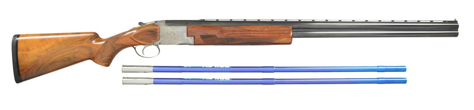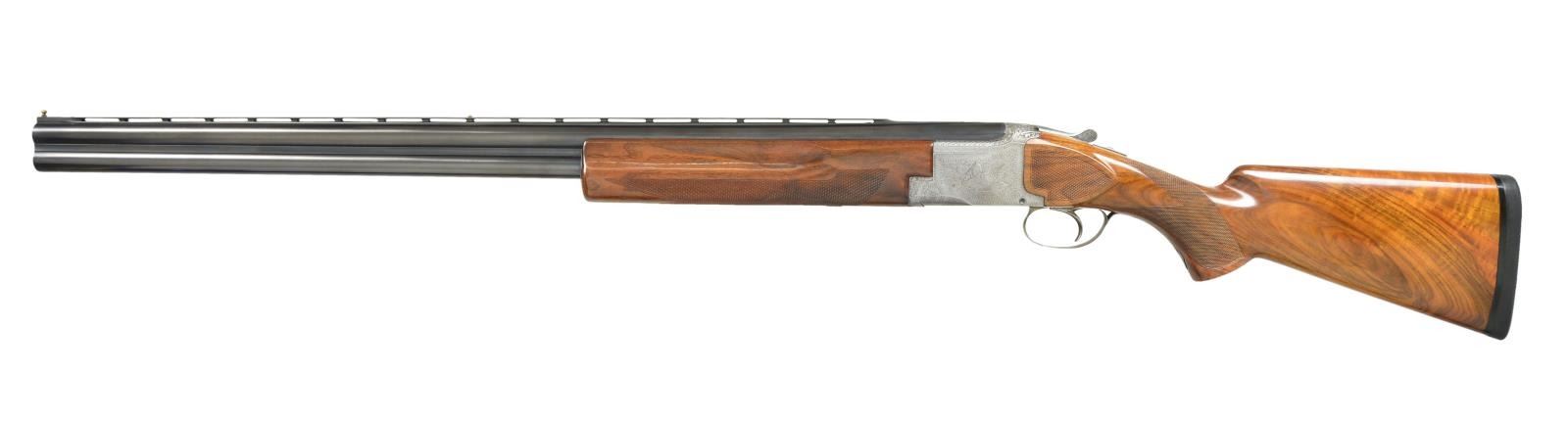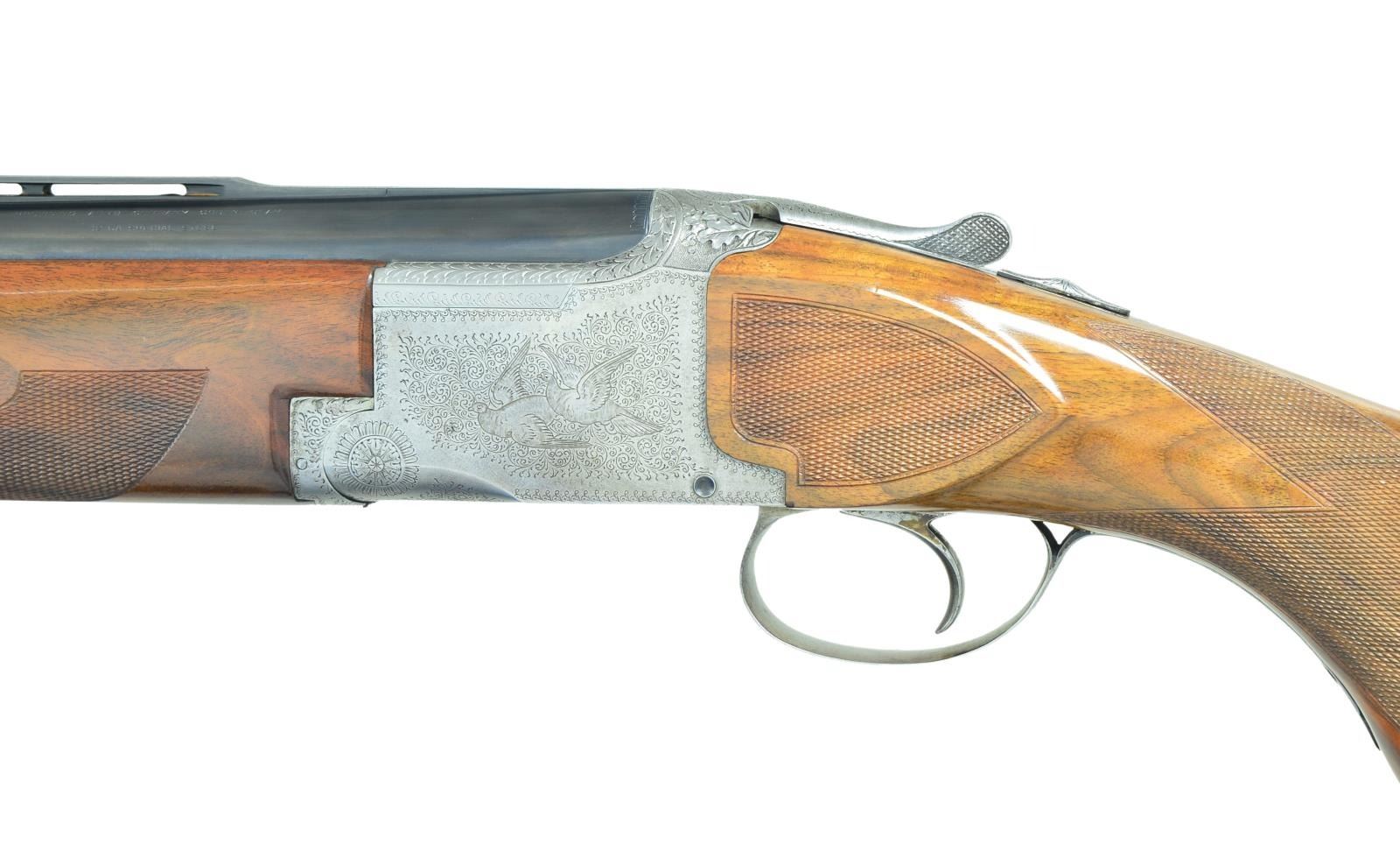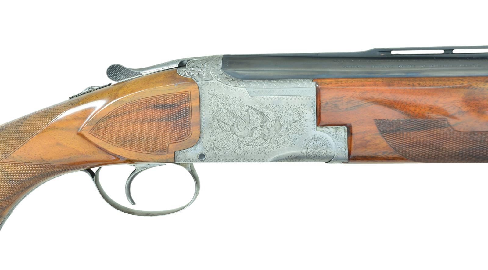 WITH CUSTOM STOCKS & 20 GAUGE BRILEY TUBES. Cal. 12 Ga., 2 3/4". S# 2004 (1932). Bbls. 30" fitted with interchangeable choke tubes also have a slightly raised ventilated rib, and the rear portion is marked "Browning Superposed". "MADE IN BELGIUM" patent numbers and FN information are on the right side of the top bbl. Left is marked "BROWNING ARMS COMPANY OGDEN UTAH" and "12 Ga. Special Steel". The coin-finished superposed action is fitted with a Miller single selective trigger; the selector is on the safety button. Action is engraved with a near-full-coverage rose and scroll on the bottom; on the sides, a pair of pigeons fly through a field of scroll. After the war, guns of this pattern became the "pigeon" grade. Top fence is in deep relief, carved with acorns and oak leaves. No engraver's signature is found. Custom pistol grip buttstock of nicely figured American walnut measures 13 7/8" over a black "Old English" pad. Sidepanels are checkered, and point pattern checkering is on grip. Matching slightly flared beavertail forend has the usual Browning latch. MEASUREMENTS: STOCK: DAH: 1 11/16". DAC: 1 1/4+". LOP: 13 7/8". CAST: neutral. WEIGHT: 7 lb., 14 oz. UNATTACHED ACCESSORIES: gun comes with tan Hartman case marked "Browning", which is lined in faun faux fur and contains 20 ga. Briley tubeset with interchangable choketubes, 4 chokes for 12 ga. bbls. (2 in gun for a total of 6), and a rapid installation tool. CONDITION: good as refurbished. Bbls. with nearly all of an old reblack Action cleaned to a coin finish. Engraving remains good. Custom stocks retain nearly all of their original varnish, with some handling and assembly marks. Bores are bright and shiny. Action is tight. Mechanically good. Case shows considerable wear and some marks. Interior cloth shows soiling. (22-2211/MGM). CURIO. $2,000-4,000.