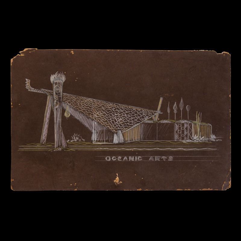 (Early 1960s) A glorious early concept rendering of a Polynesian themed restaurant building by LeRoy Schmaltz. Colored pencil on illustration board.11"x17".VG with wear, creasing and some edge chipping.