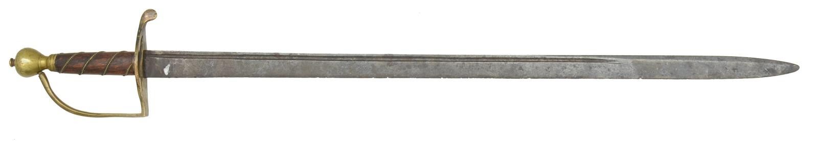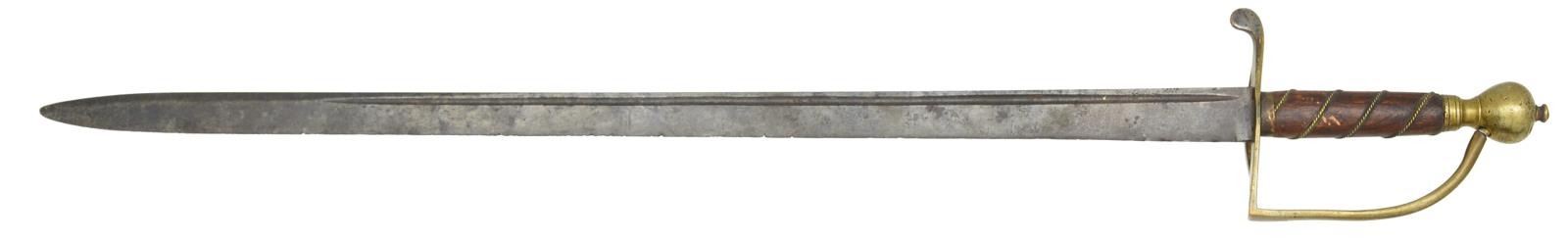 Overall length: 30 1/2". Blade length: 25". This fine sword was likely for a junior infantry officer or a senior sergeant & likely dates to the late 18th century or the dawn of the 19th century. The single fullered blade is marked on the spine, “W. ROSE” utilizing the smaller letters that were used by William Rose Sr. early in his career. A simple single branch brass guard terminates in a tapered bulbous quillon featuring a capstan rivet. The wood grip appears to be cherry & is wrapped 4 times w/ dbl. twisted brass wire. No scabbard. CONDITION: blade has a dark patina w/ numerous light nicks to the edge. Brass hilt has a deep, mellow mustard patina. Grip shows a few scuffs & scrapes but no notable damage. An exceptionally early example of Rose’s work. (02-14918/BF). $2,200-2,800.