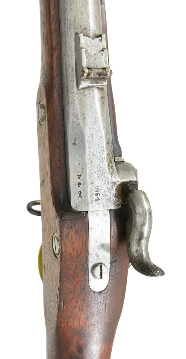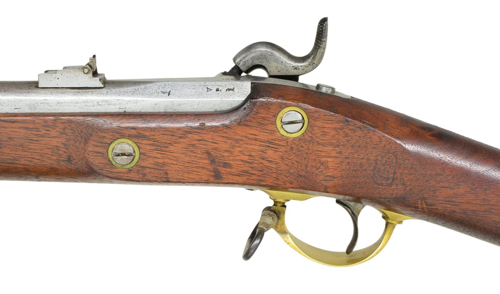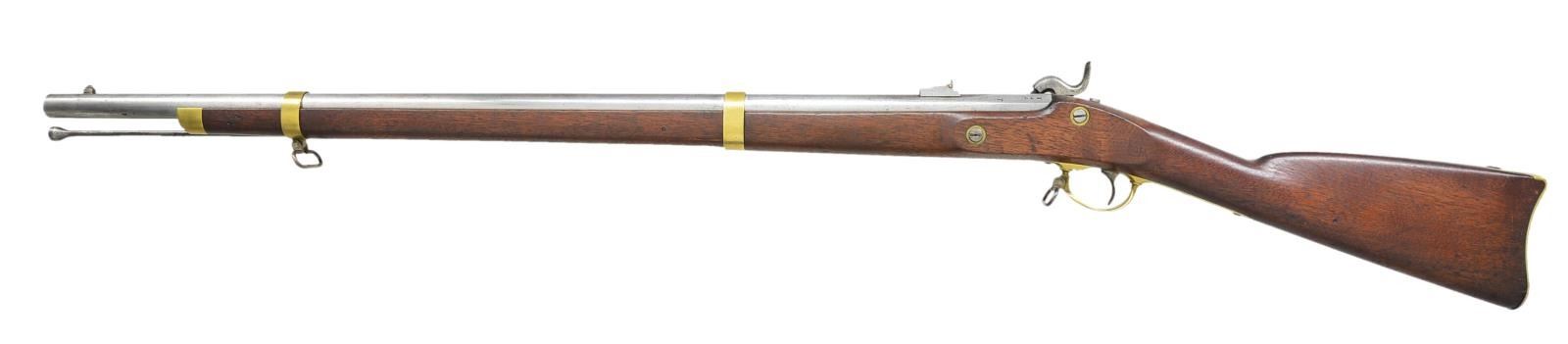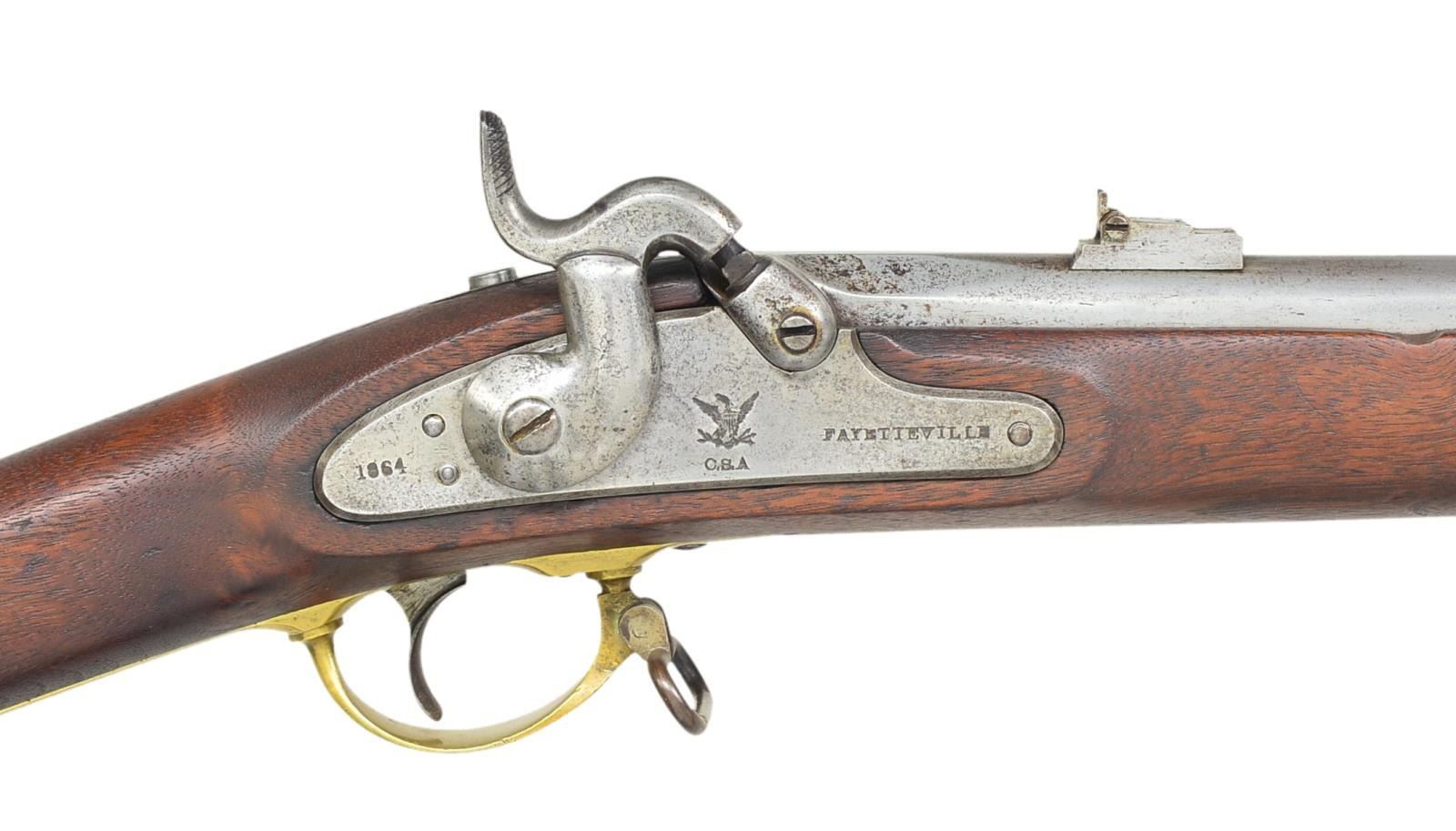 RIFLE. Cal. .58. NSN. This is a fine crisp 100% original example of the popular brass mounted Confederate rifle made in Fayetteville, NC from captured Harper's Ferry machinery. Standard configuration with 33" barrel dated “1864” at breech w/ captured Harper’s Ferry eagle font proof, “V” (viewed) & “P” (proved). The lockplate is marked forward of the hammer w/ eagle over “CSA” & “Fayetteville” & stamped behind the hammer “1864.” Buttplate has “CSA” surcharge; both barrel bands marked “U” (up). Inspectors cartouche “PB” stamped on flat opposite lock. This is a superior condition Fayetteville rifle, complete & original in every regard, crisp markings, smooth surfaces, you will not find many Fayetteville’s better than this & they will have to have the original finish. CONDITION: very good to fine overall. Barrel & lock have smooth freckled gray patina. Brass buttplate, trigger guard, barrel bands, lock escutcheons, & nosecap have smooth bright light mustard patina. Stock is sound w/ some raised grain, well fit sharp edges, well discerned cartouche, small well patinaed chip on right side between lock & rear band, unaffecting aesthetic. Mechanically fine with crisp rifled bore. (01-19500/JS). ANTIQUE. $15,000-18,000.