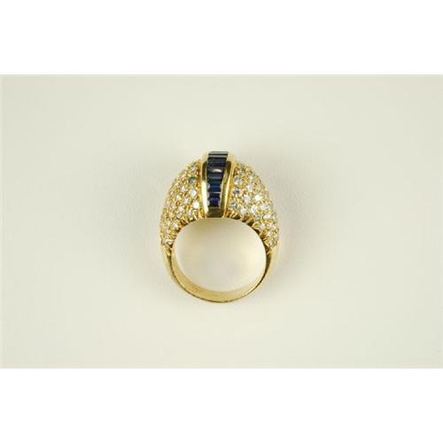 This 18k Yellow Gold Ring came from an ESTATE filled with the FINEST JEWELRY. The ring features a domed design set with 100 FINE DIAMONDS = 2.50 CARATS! The Diamonds are all FINE 'VS' Quality and FINE 'H' Color. There is a single row of Graduated Emerald Cut NATURAL BLUE SAPPHIRES of the FINEST QUALITY. This ring is now a size 6 1/4 and it can be resized either larger or smaller. IF YOU BOUGHT THIS RING IN A RETAIL JEWELRY STORE YOU WOULD PAY AT LEAST $4,000 FOR IT PLUS THE SALES TAX!