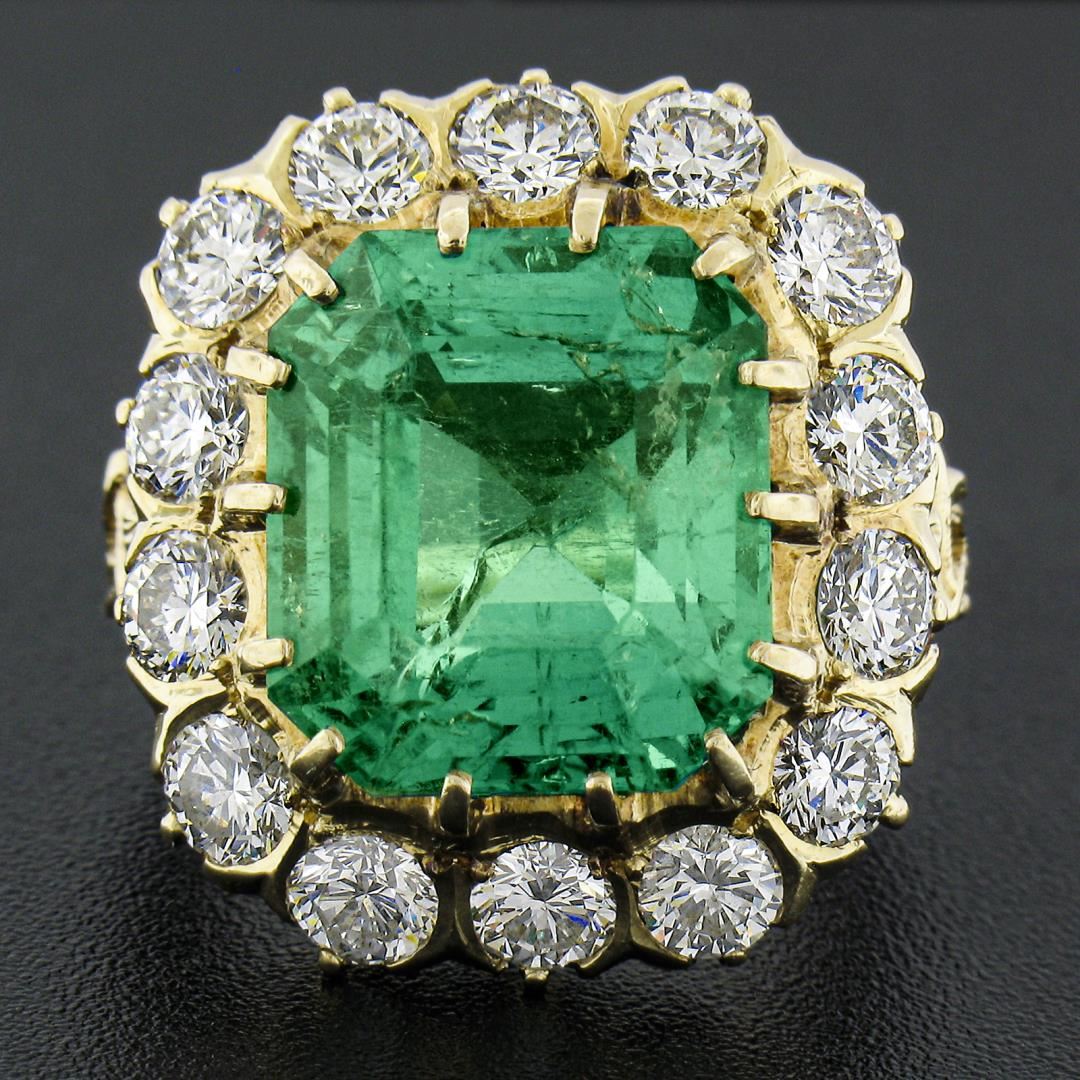 A solid 18k yellow gold cocktail ring, with 1 AGL graded emerald cut natrual colombian emerald (11.5ct ), surrounded with a halo of 14 round cut natural diamonds (F/G - VS1/VS2 ; 2.80ctw). The ring is size 6.5, weighs a total of 13.68 grams, and measures 23mm wide. Comes with all original relevant certifications.
