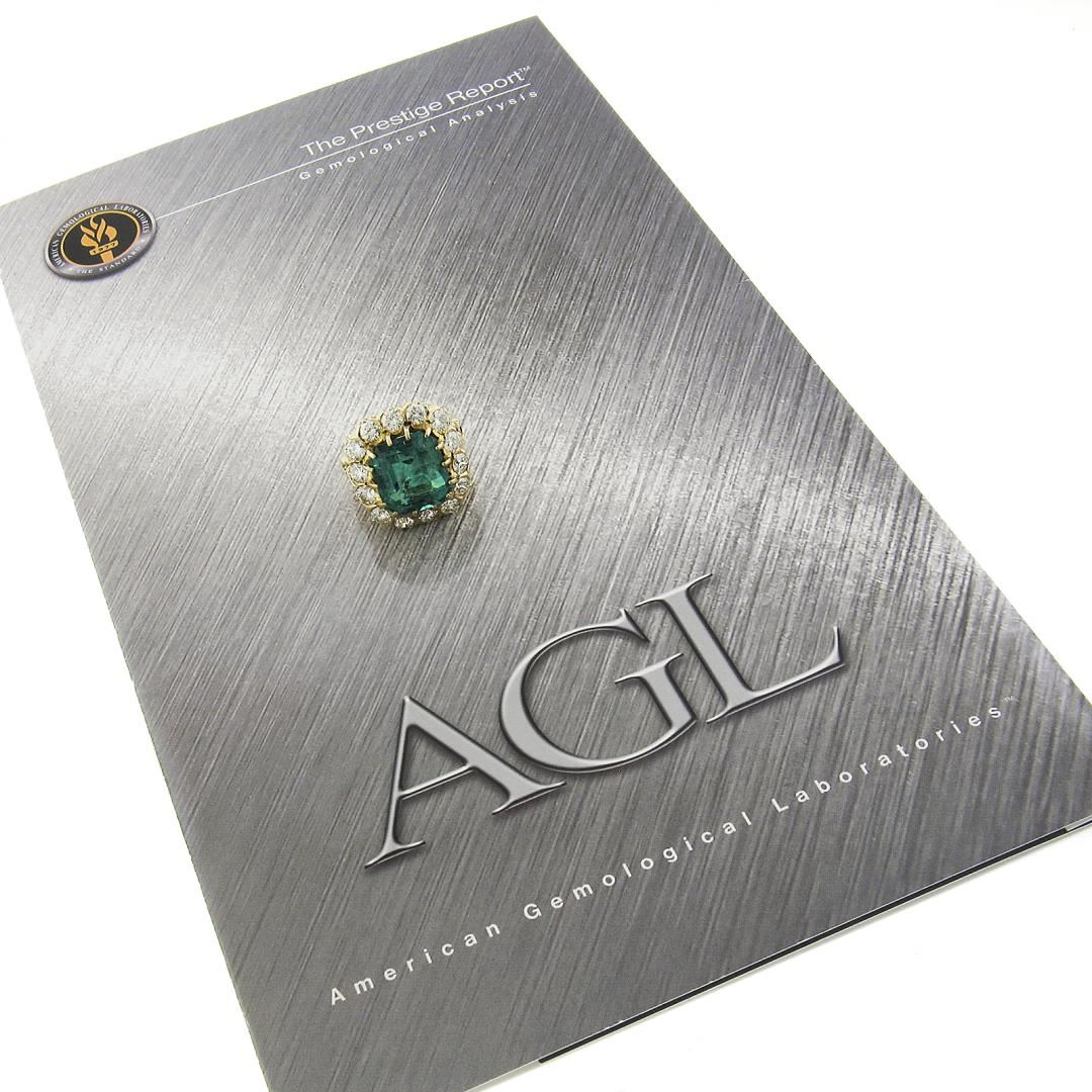 A solid 18k yellow gold cocktail ring, with 1 AGL graded emerald cut natrual colombian emerald (11.5ct ), surrounded with a halo of 14 round cut natural diamonds (F/G - VS1/VS2 ; 2.80ctw). The ring is size 6.5, weighs a total of 13.68 grams, and measures 23mm wide. Comes with all original relevant certifications.