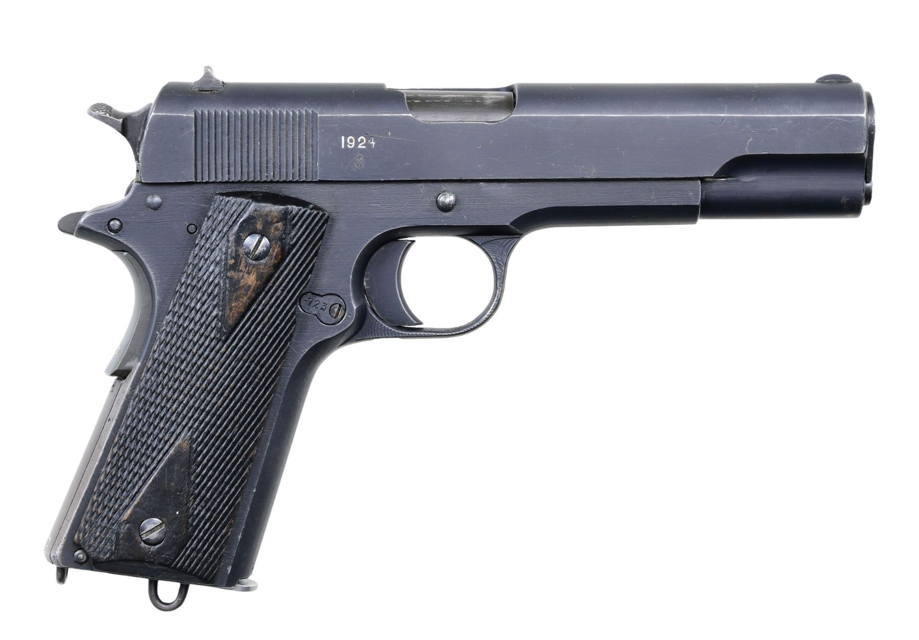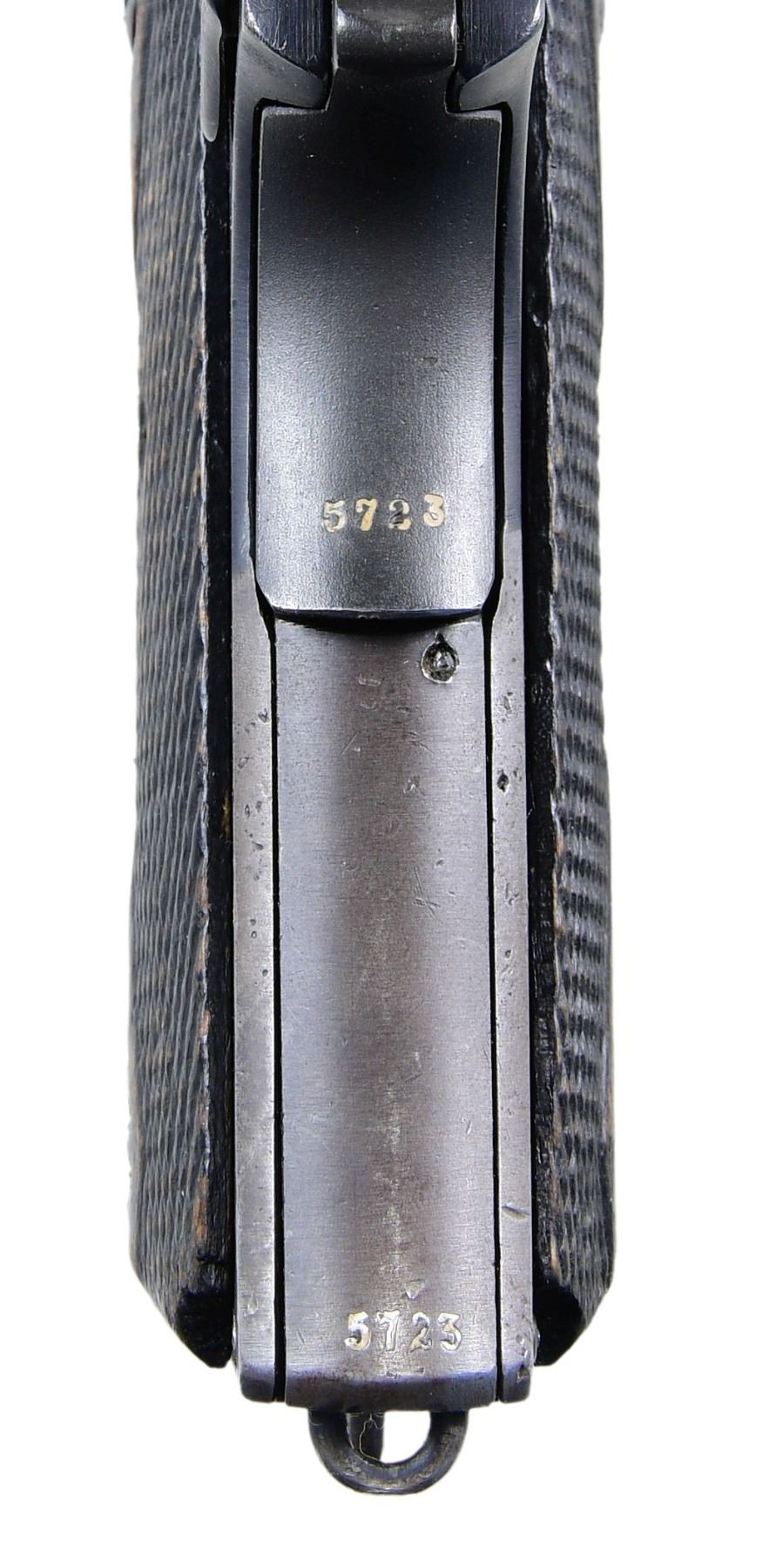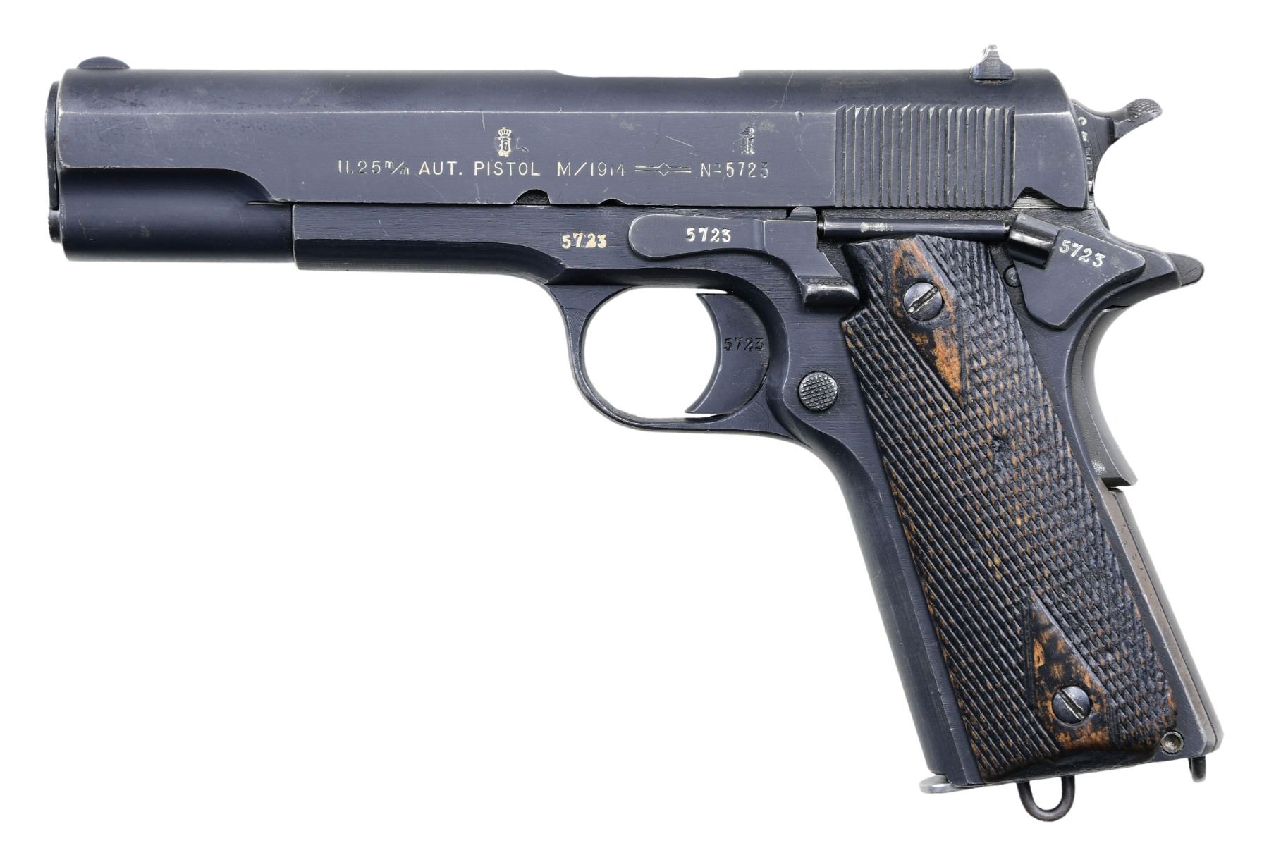 SEMI AUTO PISTOL. Cal. 11.25mm (45 ACP). S# 5725. Mfg. 1925 as Norway's standard issue sidearm; s# range 5701-7600. Slide has Monogram of King Haakon & Kongsberg Crest on left side of slide along with Erling Schold inspector's stamp & 1924 date on right side of slide. Matching numbered 5" barrel, slide, trigger, slide lock, safety lock, hammer, ejector, grip safety, mainspring housing, recoil spring guide, recoil spring plug, barrel bushing & hammer strut. Matching ".723" on mag. catch, firing pin, firing pin plate, disconnector & sear. Extractor not numbered. Two piece birch grips with left panel scratched on back "JRN 1924". MAGS: 1 - 7 rd. with lanyard; mag. appears heavily cleaned showing prior pitting turning gray. CONDITION: very fine retaining approx. 90% original blue finish. Frame shows scattered light handling marks. Mainspring housing & corresponding areas of frame has cleaning with finish being a gray patina. Triggerguard bow has areas of pitting & loss of finish. Slide shows scattered light marks & spots of wear. Balance of markings appear to have added faded white paint. Good grips show flattened diamonds & small gouges. Barrels shows good fading blue with cycling wear. Bore shows strong rifling with light pitting forward of chamber. (24-6850/MD). CURIO. $1,500-2,500.