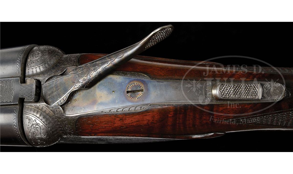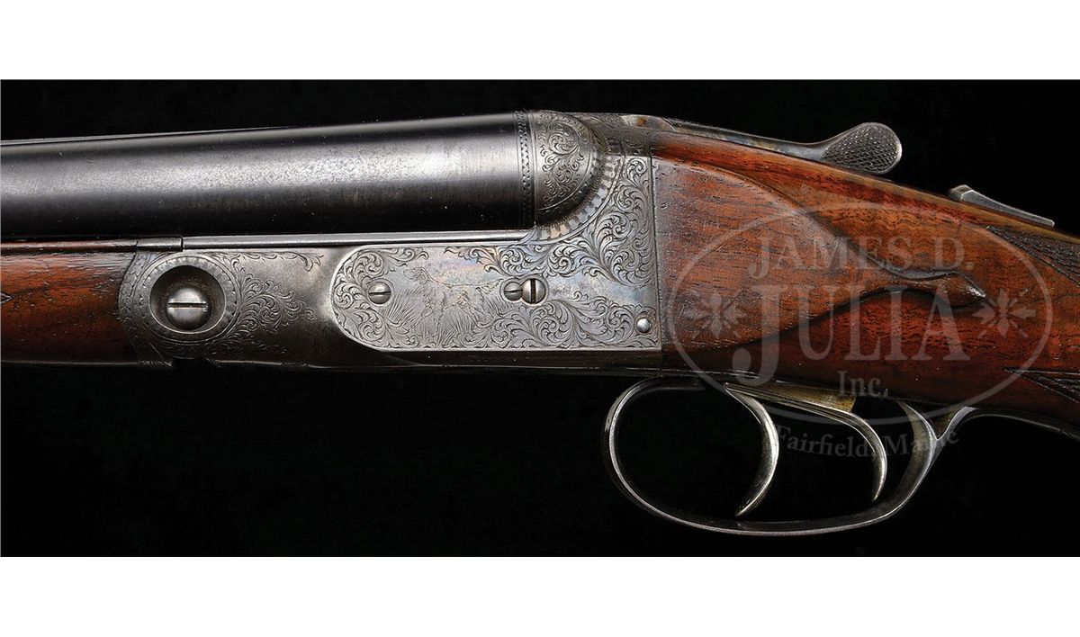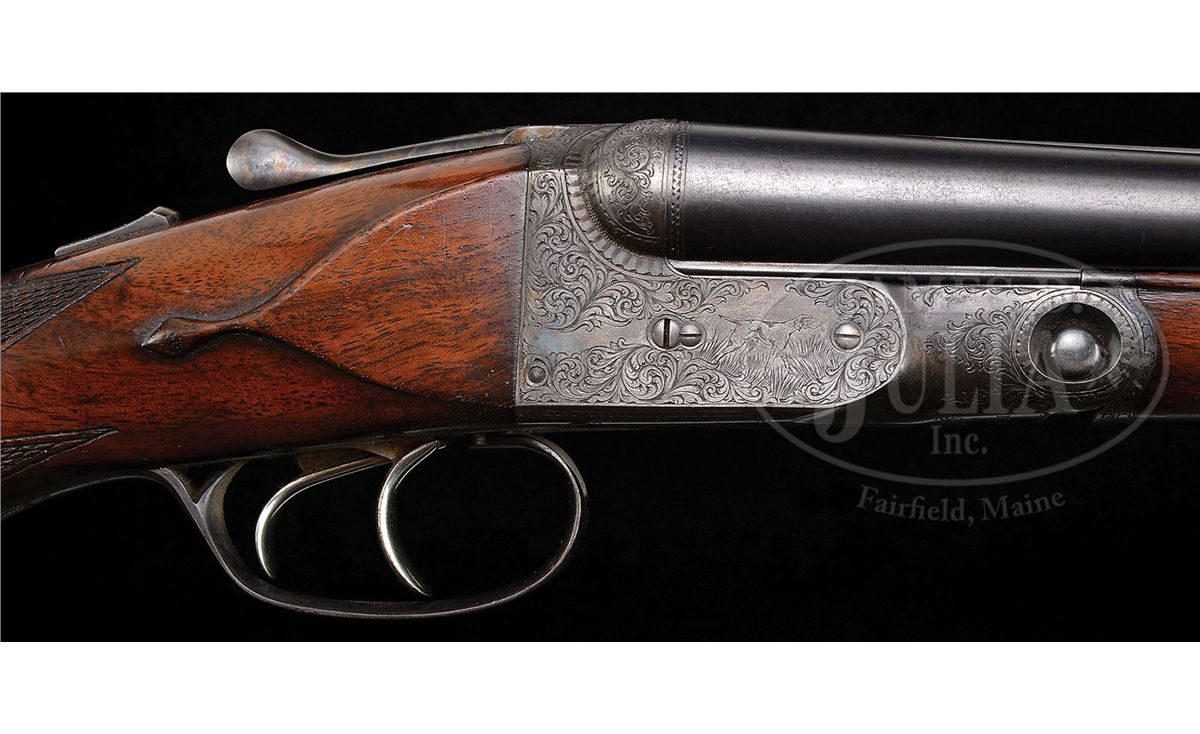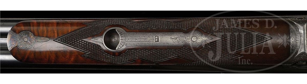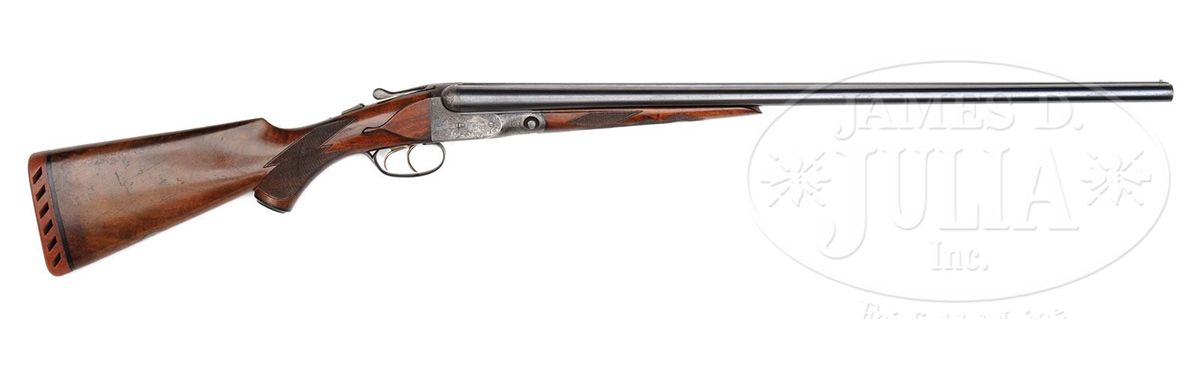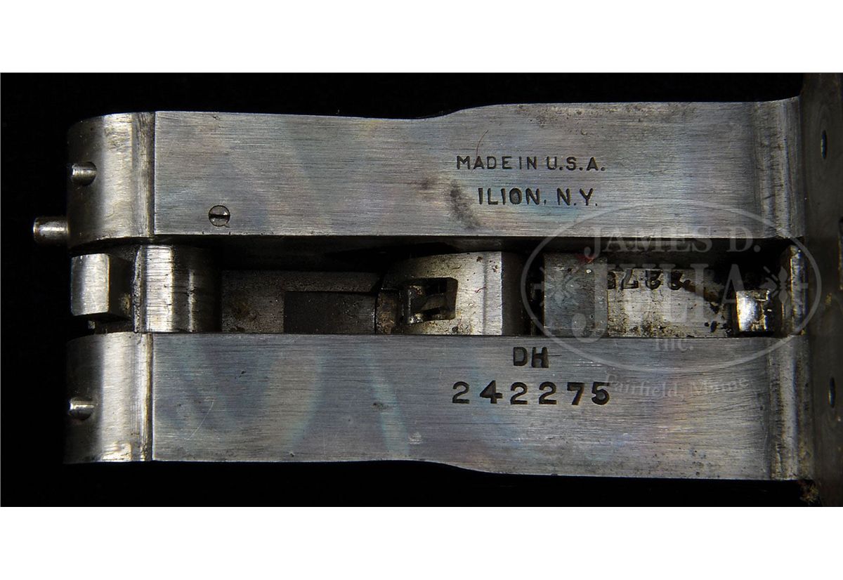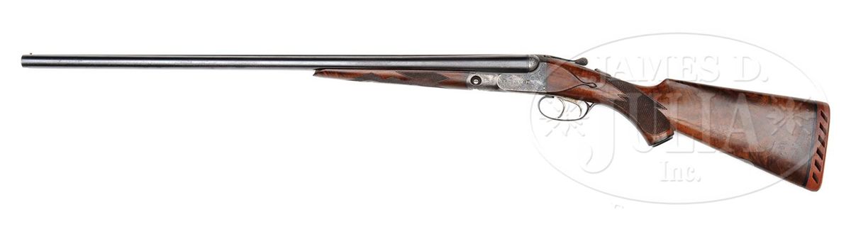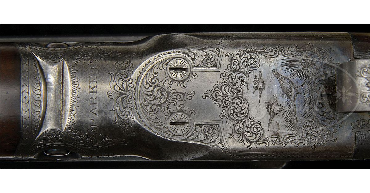 SN 242275. Cal. 20 ga. 2-3/4" Chambers. 0 Frame. 26" Bbls with unmarked rib, are marked with Parker proofs, SN, Remington stampings, as well as chokes, "Imp. Cyl" and "Full" on bbl flats. Water table is marked with grade, SN, and "ILION, N.Y." Case hardened action features automatic safety and nickel-plated double triggers, and is engraved in typical "D" style with well cut setter on left, pointer on right, and with trio of pheasants on trigger plate. Bottom of action is engraved "PARKER". Areas on sides of action where "Parker Bros" is normally engraved, are left blank. Finely crotch figured American walnut capped pistol grip buttstock incorporates all "D" quality features, and measures 13-3/4" over red, open-sided pad. Matching splinter ejector forend has typical latch and steel tip filed flat. Bore diameter: left-.619, right -.619. Bore restrictions: left -.020 (Full), right -.006 (IC). Wall thickness: left -.032, right -.030. Drop at heel: 2-3/8", drop at comb: 1-3/16". Weight: 6 lbs. 8 oz. LOP: 13-3/4". CONDITION: Excellent. Bbls retain over 85% orig blue, with considerable light freckling and a few marks. Action retains approx 70% orig case hardening color, turning to dark gray at bottom and on fences. Trigger guard retains most of its orig blue, most loss due to flaking. Stocks retain nearly all of their orig finish, are quite dry, with numerous handling marks and light scratches. Slightly worn through at grip, nose of comb, and on forend with additional finish loss around butt from installation of newer pad. Bores are excellent, bright and shiny throughout. Action is tight. Bbls are on face. Ejectors are in time. 4-49103 MGM291