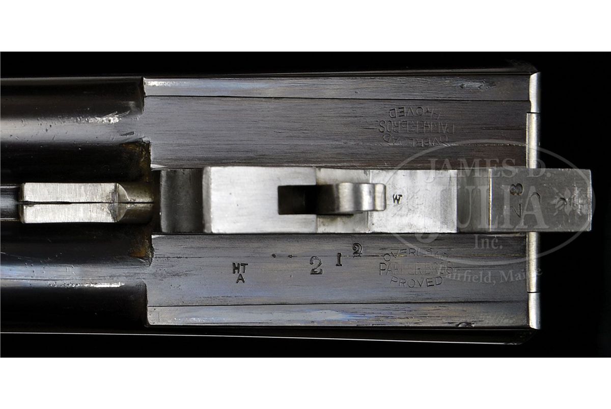 SN 224781. Cal. 28 ga. 2-1/2" Chambers. 00 Frame. 28" Bbls are marked on top rib with Parker name and address along with "Acme Steel". Bbl flats are stamped with Parker Overload proofs, and "HTA". Water table is stamped "5". Correctly colored case hardened action has had single bead neatly filed in on fences, and engraved with a very fine, well cut reproduction of typical BHE engraving, with a pair of pointers on left, setters on right, each in front of "Parker Bros" in scroll terminated riband. Trigger plate depicts buck and doe grazing in mountain meadow. Straight grip trigger guard has flourishes of scroll on bow, and SN at grip. Lightly crotch figured and nicely streaked European walnut straight grip buttstock measures 14-3/16" over skeleton steel buttplate. Comb is nicely fluted, and fleur-di-lis drop points of checkered side panels, well carved. Checkering faithfully reproduces "B" pattern with mullered fancy border. A large vacant gold oval is on toe line. Matching splinter ejector forend is near fully checkered. Bore diameter: left-.550, right -.550. Bore restrictions: left -.024 (Full) right -.026 (Full). Wall thickness: left -.016, right -.021. Drop at heel: 2-1/8", drop at comb: 1-1/2". Weight: 5 lbs. 12 oz. LOP: 14-3/16". PROVENANCE: Parker letter with specifications for this SN indicating it left the factory as a VHE 28 bore with 28" bbls, with capped pistol grip stock, in 1927. CONDITION: Excellent, retaining nearly all of its custom finishes on metal. Wood has only a few light scratches. Bores are excellent. Action is tight. Ejectors are in time. 4-48976 MGM111