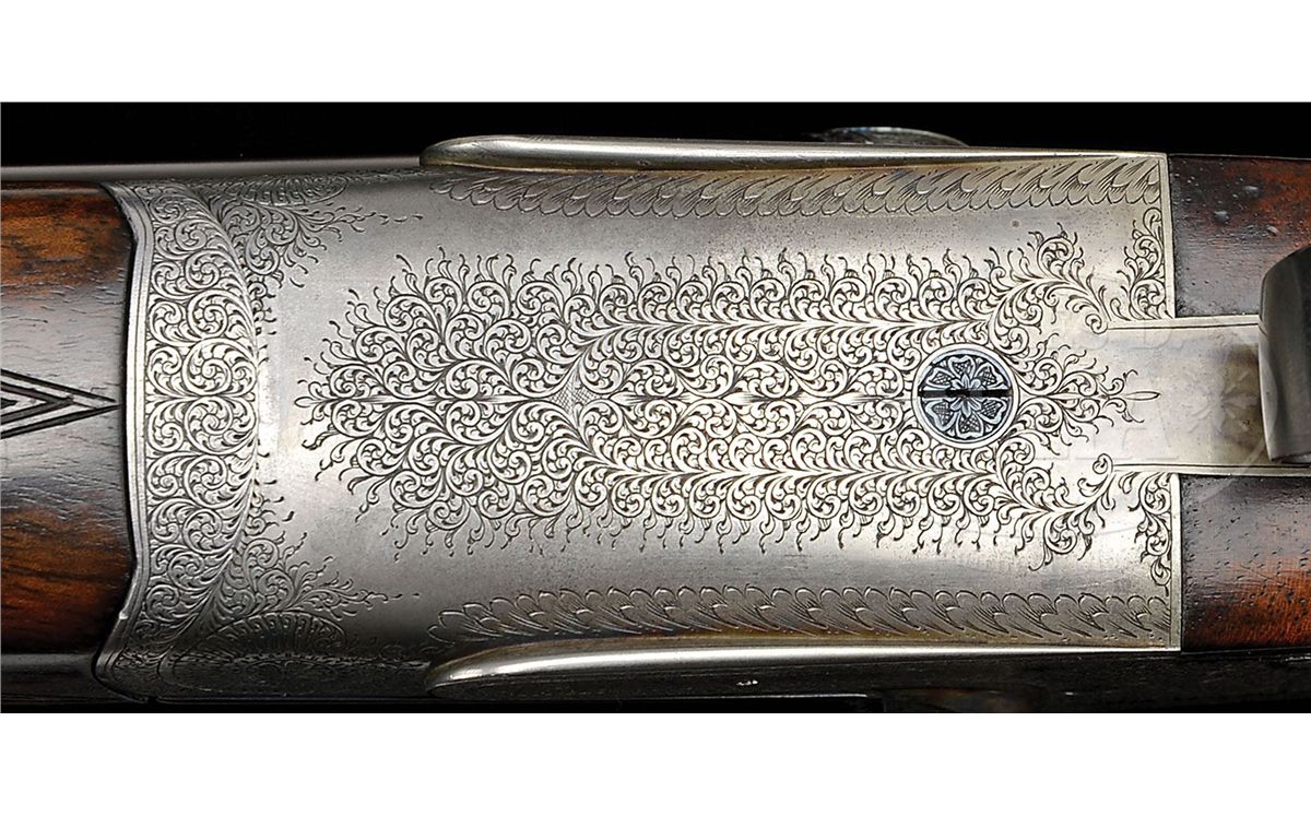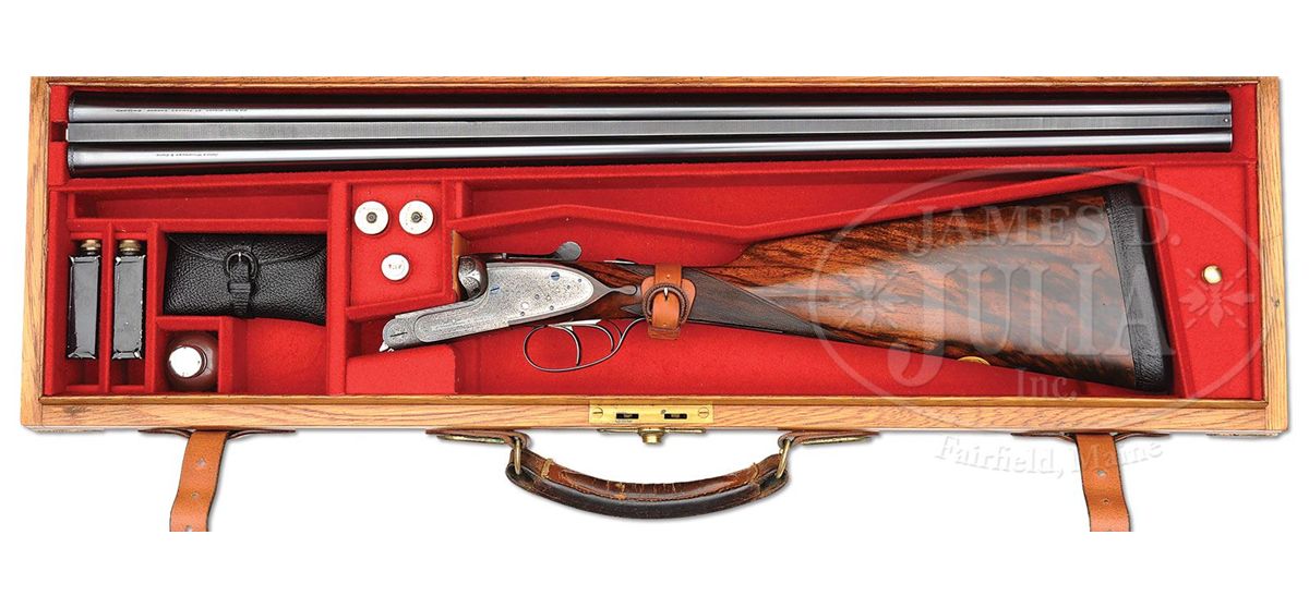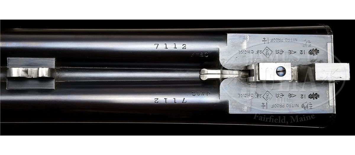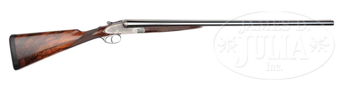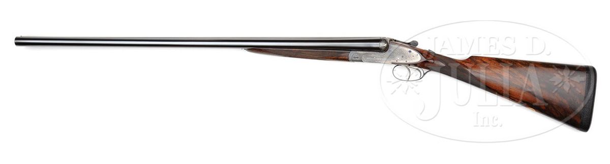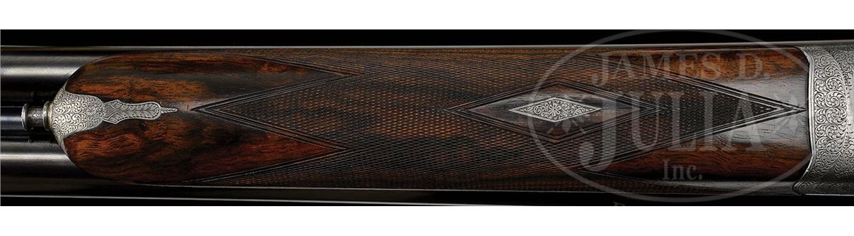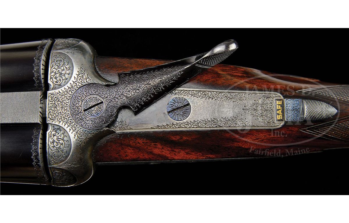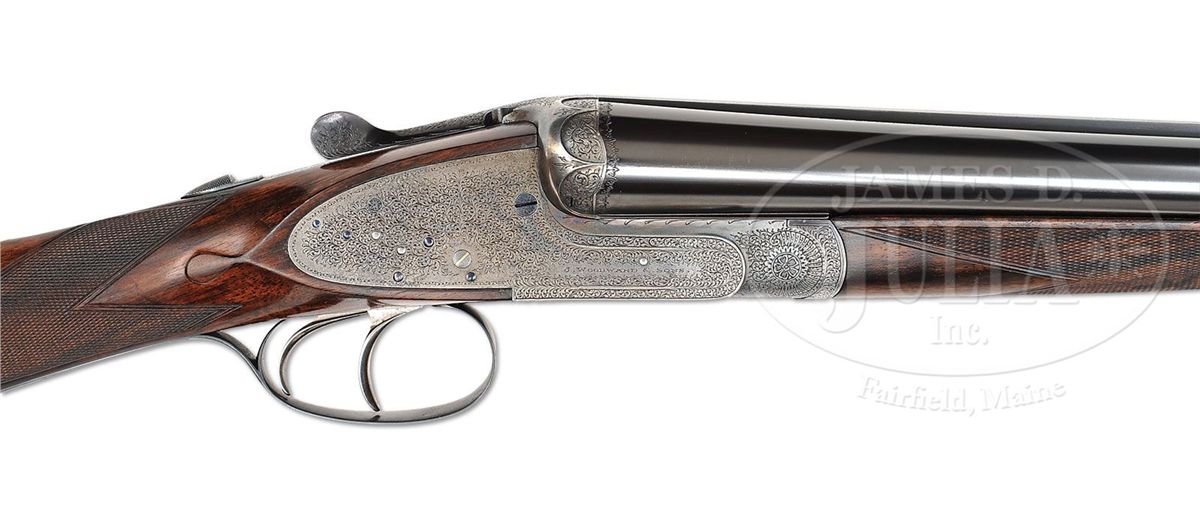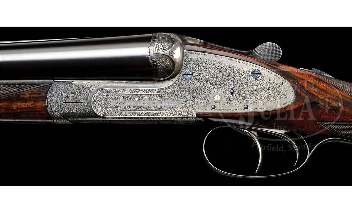 SN 7112. Cal. 12 ga. 2-3/4" Chambers. 30" Chopper lump bbls with slightly raised, flat, matted rib are engraved "James Woodward & Sons." and "29 Bury Street. St. James's. London. England." on tops. Bbl flats are stamped with London nitro proofs for 2-3/4" chambers and 1-1/4 oz. of shot. Bottoms of bbls are stamped with SN. Robust, full sidelock, case hardened action is stocked to the fences, and features non-automatic safety (SAFE inlaid in gold), bushed strikers, side clips, hidden third fastener, gold line tumbler end cocking indicators, and double triggers with front trigger articulated. Action is filed with simple beads on bar, and classic Woodward arcaded fences. Action and lockplates are engraved with about 80% coverage very well cut, small, shaded scroll. "J. Woodward & Sons" is on each lockplate. Top lever and trigger guard are blued and also scroll engraved. SN is at grip. Beautifully marbled and lightly figured European walnut buttstock measures 15-1/8" over black leather covered pad, and features slight diamond hand, drop points, classic point pattern checkering with mullered borders, and a gold oval on toe line engraved with monogram "SO" (Woodward records indicate that it was made for "Sami Ozan"). Matching large (factory records indicate 9-1/8") splinter ejector forend has Anson release. Bore diameter: left-.729, right -.730. Bore restrictions: left -.032 (Full), right -.021 (Mod). Wall thickness: left -.028, right -.026. Drop at heel: 2-3/8", drop at comb: 1-1/2". Weight: 7 lbs. 13 oz. LOP: 15-1/8". Makers oak and leather case with brass corners, is embossed "J. F. T. Jr." on top. Interior is lined in scarlet cloth, with gold embossed black leather Woodward label and secondary paper instruction label on lid. Case contains 2-pc hard rubber and brass cleaning rod with mop, jag, and brush in black morocco wallet. Most of the other accessories are Woodward marked including: glass oil bottle with green label, two Japanned tins with brass tops (one with green label, the other unmarked), pair of horn bodied snap caps with German silver heads marked with patent information, and nickel-plated brass striker bottle with strikers, marked with SN. PROVENANCE: Copy of orig Woodward ledger. CONDITION: Excellent, as partially refinished. Bbls retain essentially all of an excellent quality, dark, London re-black, engraving clear, rib slightly softened. Action retains a considerable amount, perhaps 30%, orig case hardening color, vivid where protected. Lockplates retain a similar amount of their color, over all appearance is a very pleasing mottled silver to pewter gray. Pin heads have been fire blued, and retain nearly all of that brilliant blue. Top lever and trigger guard retain nearly all of a re-blue, engraving still sharp. Stocks retain nearly all of an old rubbed oil finish over a few light marks, and with a number of subsequent minor handling marks. Checkering correctly and competently re-cut. Bores are excellent, bright and shiny throughout, with no visible imperfections. Action is tight. Bbls are on face. A correct glimmer of light shows between bbl flats and water table when gun is closed. Ejectors are strong and in time. Case leather is very fine, with a few knocks and scuffs, mostly along edges. Straps are new, and excellent. Orig handle is fine. Interior cloth has been renewed, and is excellent, with only some minor compressions and light soiling. Makers label is very fine. Instruction label is foxed and has some soiling. Accessories are fine. Snap caps have some stray dents and scratches. Top of oil bottle is loose, and glass is missing its ferule. Woodward made very few pigeon guns, and this example which measures perfectly, is simply a lovely gun. 4-49315 MGM264