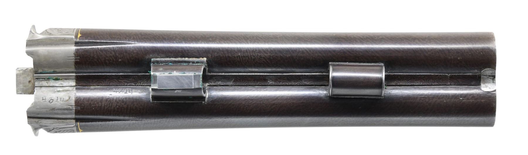 PISTOLS BY A.V. LEBEDA OF PRAGUE WITH ACCESSORIES. Cal. 52 right barrel rifled, left barrel smooth. S# NSN (both). Anton Vinzent Lebeda was a fairly famous Prague gunsmith trained in Germany and Vienna who built guns and rifles for Kaiser Franz Josef 1st. These high quality pistols have 6-3/8" skelp damascus barrels that are unmarked. Rear of ribs are two color gold inlaid with very finely detailed flowers and foliage. Breech plugs without blow outs are nicely engraved. Breech irons with elevation adjustable rear sights are also scroll engraved and gold inlaid with the numbers "1" or "2" at rear. Front spring percussion locks with rebated tails have round bodied hammers. They are engraved with full coverage acanthus scroll with delicate shading. Right lock is engraved "LEBEDA", left "A PRAGUE". Trigger plate has engraved spire finial and trigger guard has scroll on bow. This very nicely cut and shaded engraving is enhanced by metal with its original French gray finish. Stocks with deep checkered bag grips are made of very well marbled European root walnut. Relief cast fancy silver crest plates at tops of grips are engraved "NS". Stocks attach to barrels with sidebolts through oval steel escutcheons. Rosewood ramrods with brass tips and tails mount through beaded pipes without thimbles. UNATTACHED ACCESSORIES: pistols are housed in their original mahogany case with shaped German silver medallion on top engraved "Nickolaus Stieglitz". Case is lined in green cloth with gold embossed area of lid printed with maker's name and address. Bottom compartment is fully French fitted for pistols and fine array of original accessories including bright polished steel bullet mould, ebony handled nipple wrench, ebony and brass loading mallet, brass three compartment powder flask, turned ebony cap bottle (containing a spare nipple) and turned horn loading funnel. There are two covered compartments. One contains a brass tag marked "18" and a Bob Jeche business card. The other compartment contains lead balls and a cancelled Czechoslovakian postage stamp featuring a percussion pistol by Lebeda. CONDITION: exceptionally fine. Barrels with over 90% original brown. French gray remains bright and without any wear on metal parts. Trigger blades retain most of their temper blue. Stocks retain over 90% original French polish with a scattering of marks. Bores are bright and shiny with some scattered pits. Mechanically crisp. Case exterior is fine with nearly all original finish, showing some marks, compressions and a 14" crack 3" behind front of case. Interior cloth is very good with rubs and compressions. Gold of maker's name almost completely faded away. Accessories are fine to very fine. (01-26474 & 01-26475/MGM). ANTIQUE. $4,000-6,000.