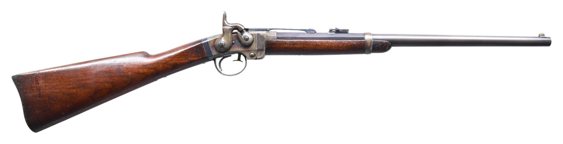 Cal 50. S# 11430. This popular Civil War carbine saw little use and retains most all of its original bright finish. Standard configuration, 21-5/8" part octagonal to round barrel, iron mounted, blue and case color finish. Left side of breech is marked "ADDRESS / POULTNEY & TRIMBLE / BALTIMORE, U.S.A." & "SMITH'S PATENT / JUNE 23 1857" & "MANUFACTURED BY / AM'N M'CH'N WKS / SPRINGFIELD MASS". CONDITION: fine to excellent overall, barrel about 90% thinning blue finish, toned to plum/blue, frame retains about 90% bright case colors, most original fire blue is found on frame ferrule & barrel to frame latch. Stocks are fine with two bright inspector cartouches. Mechanically fine with bright shiny rifled bore. (01-26566/JS). ANTIQUE. $2,500-3,500.