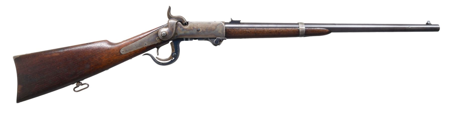 RING CARBINE. Cal. 54. S# 16863. 39" overall, 21" barrel, two position rear leaf sight, tall blued steel pinched blade front sight. Conforms to other Civil War carbines of this pattern. This carbine utilized the unique Ambrose Burnside designed "ice cream cone" shaped brass percussion cartridge. This is the standard Model 1864 marked "BURNSIDE PATENT / MODEL OF 1864" on breech & "BURNSIDE RIFLE CO / PROVIDENCE RI" on back action lock. Most of these guns in this serial range were issued to midwestern cavalry units. This very fine survivor saw little use with just minor handling marks. CONDITION: very fine overall & all matching. Barrel retains 90% plus thinning factory blue, marked with inspector initial and partially struck "CAST STEEL 1864". Breech block, lever, trigger guard plate & rear tang retain most of their original bright fire blue. Frame, hammer, and buttplate retain about 70% muted case colors, lock has strong traces of case color, balance silver/gray. Stocks are sound and well fit, Crisp inspector cartouche "RKW" (Captain Robert Henry Kirkwood Whiteley). Mechanically fine w/ crisp bright bore. (01-26027/JS). ANTIQUE. $2,500-3,500.