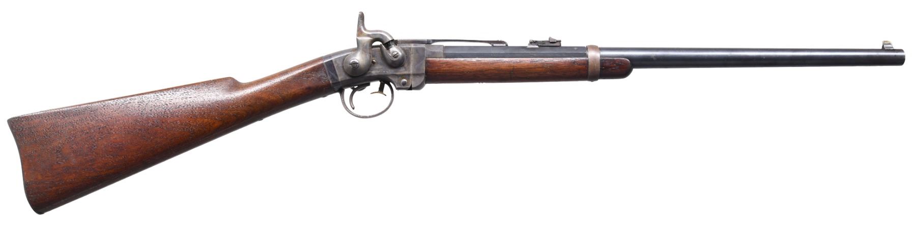 Cal 50. S# 19404. There are about 20 carbines issued to 11th Illinois cavalry according to Springfield Research in serial range 18673-19764, this number is not listed but 19407 was issued to the 11th. This carbine saw little use and retains most all of its original bright finish. Standard configuration, 21-5/8" part octagonal to round barrel, iron mounted, blue and case color finish. Left side of breech is marked "ADDRESS / POULTNEY&TRIMBLE / BALTIMORE U.S.A."; "SMITH'S PATENT / JUNE 23 1857"; & "MANUFACTURED BY / MASS ARMS CO / CHICOPEE FALLS". CONDITION: fine to excellent overall, barrel retains 95% plus original right the blue finish, frame retains about 70% muted case colors, much original fire blue is found on frame ferrule & barrel to frame latch. Stocks are fine with two bright inspector cartouches. Mechanically fine with bright shiny rifled bore. (01-26017/JS). ANTIQUE. $2,500-3,500.
