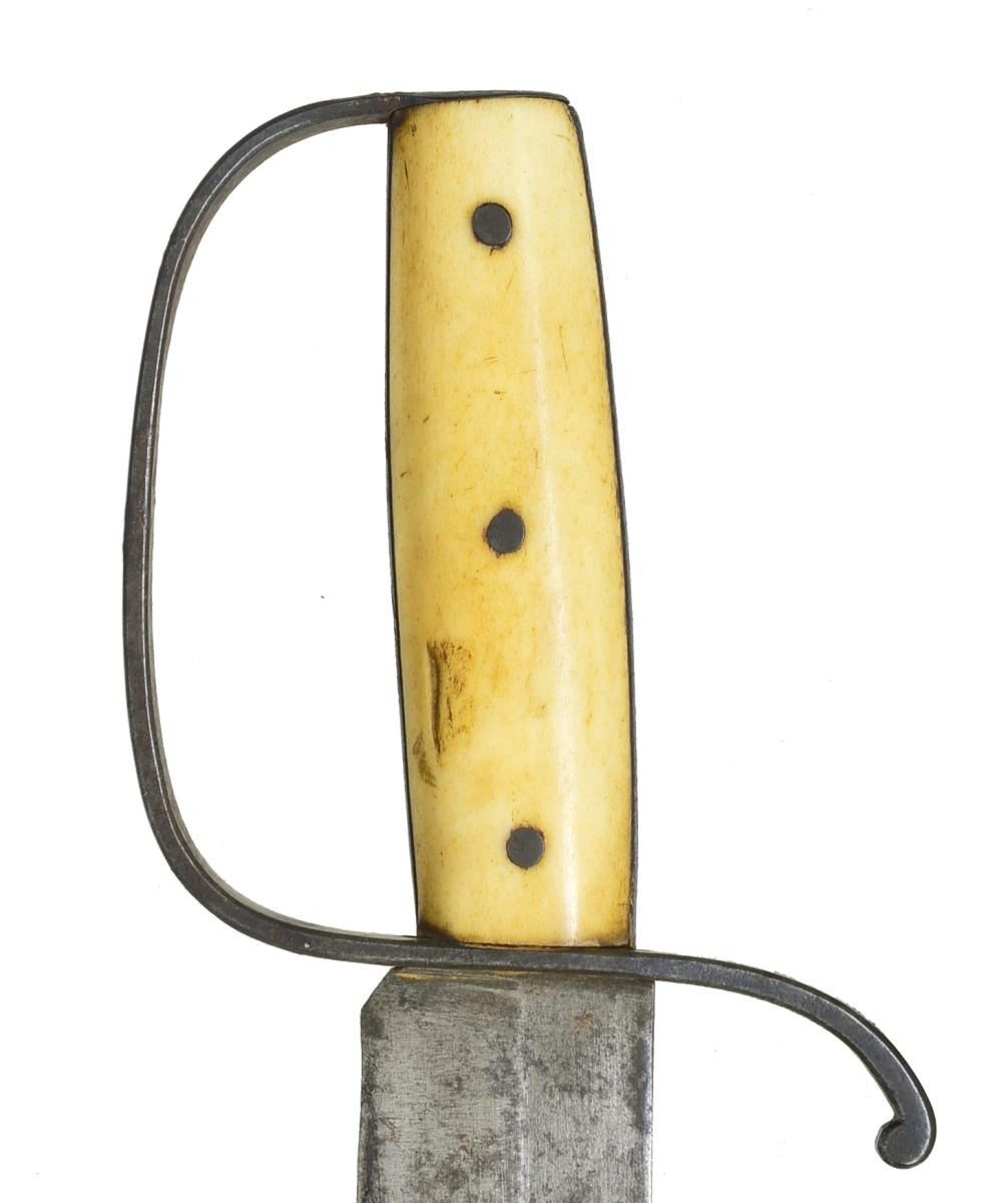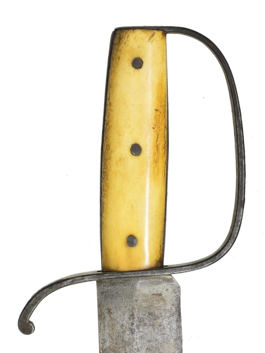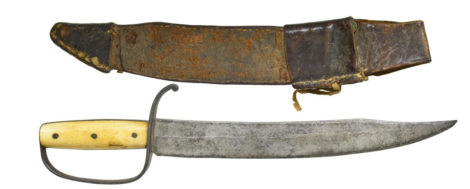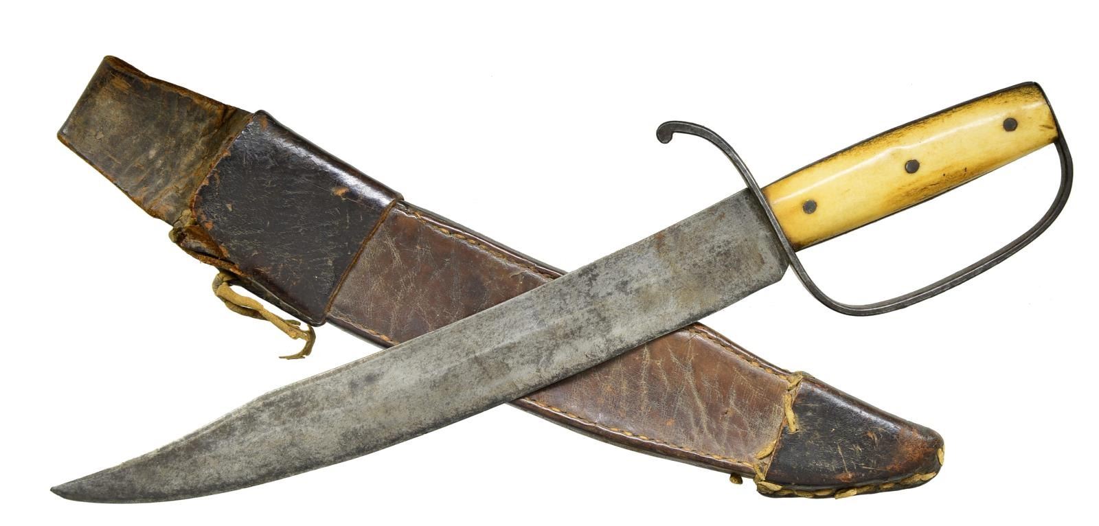 ORIGINAL SHEATH. 16.5” Overall, 12” relief ground clip point blade, .25” thick. This extremely well made & preserved Confederate knife has bone slab grips, each retained by 3 large iron pins. The guard is elegantly shaped w/ well-formed knobbed quillon. Original sheath made by sewn & riveted brown reinforced leather w/ leather toe & integral leather belt loop. It would be difficult to find a better classic Confederate D-guard made by a gifted Southern craftsman in all aspects of manufacturer that has survived in such beautiful condition. CONDITION: very good to fine overall, blade is overall gray w/ staining & light pitting, guard has smooth iron patina. Grips are well fit w/ hand worn patina. Sheath is complete, sound, solid & retains much of its original polished surface. (02-14543/JS). $6,000-8,000.