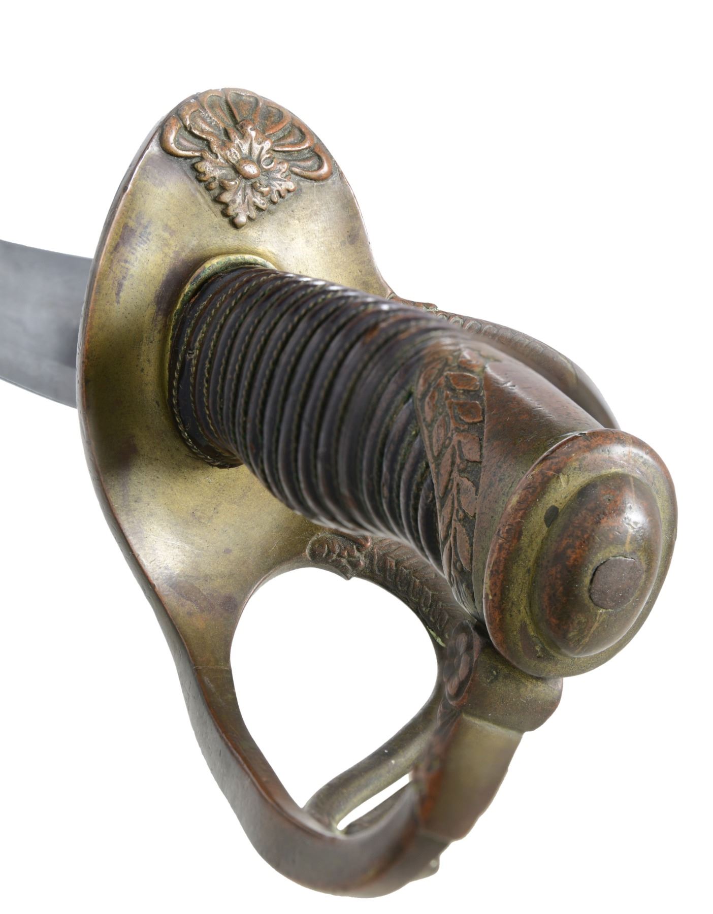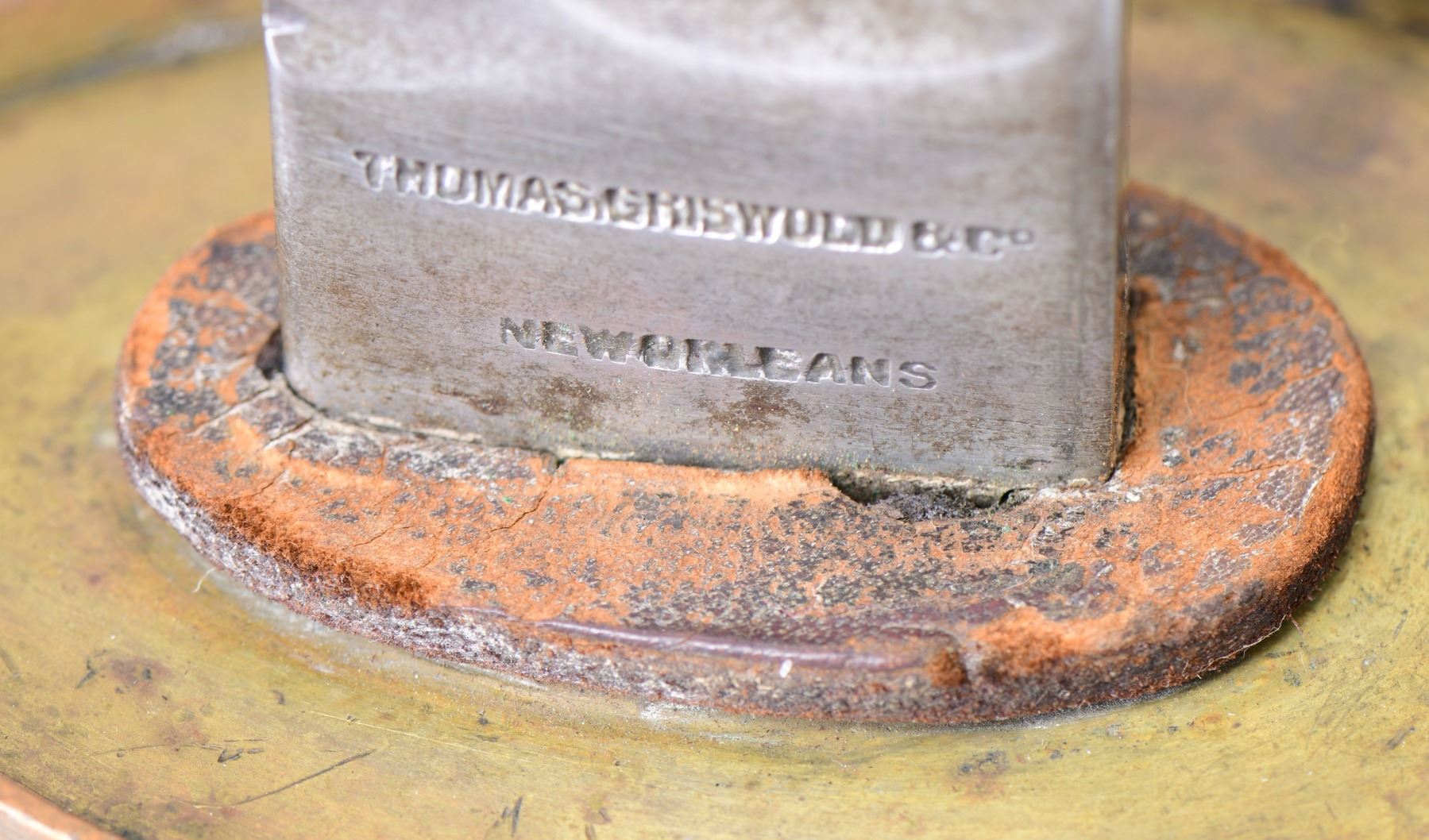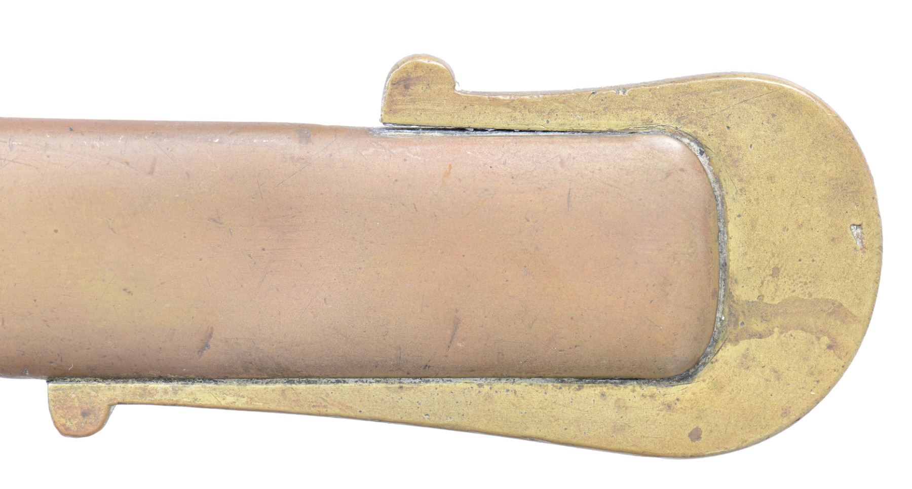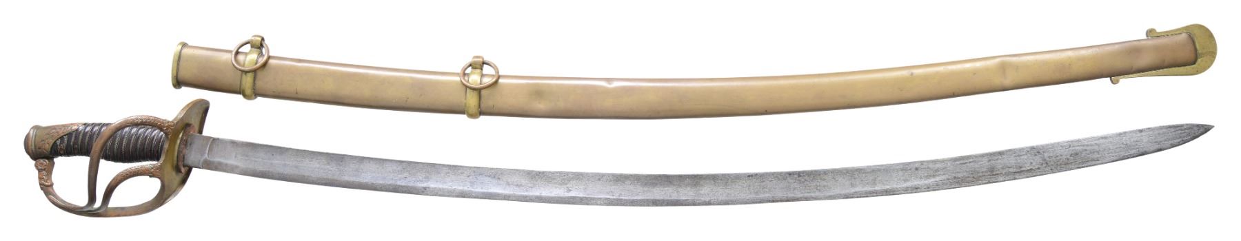 OFFICER'S SABER WITH RAREST MAKER MARK. Thomas, Griswold & Company made the finest quality swords in the Confederacy. The address stamped on ricasso is rarely seen in two straight lines: "THOMAS GRISWOLD & CO., NEW ORLEANS". This cavalry officer's saber as many of their products, had their signature solid brass scabbard. These swords were so popular in their day that several Confederate Generals carried them and even one Union General was known to have carried one that he must have captured at some campaign during the war. It would be difficult to upgrade this fine example especially with rare full firm straight line address. CONDITION: 35.5" blade is fine & overall gray/bright, uncleaned with scattered light staining, very good point. Maker's mark is crisp. Grip retains most all its original high polish brown leather, few small chips & scuffs, complete tight twisted wire wrap. Original protective leather washer is solid. Brass hilt and scabbard have fine matching dark mustard colored patinas. Well fit scabbard body has few light dents unaffecting the overall aesthetic. PROVENANCE: ex-Dr. Joseph Murphy collection. (02-23610/JS). $10,000-12,000.