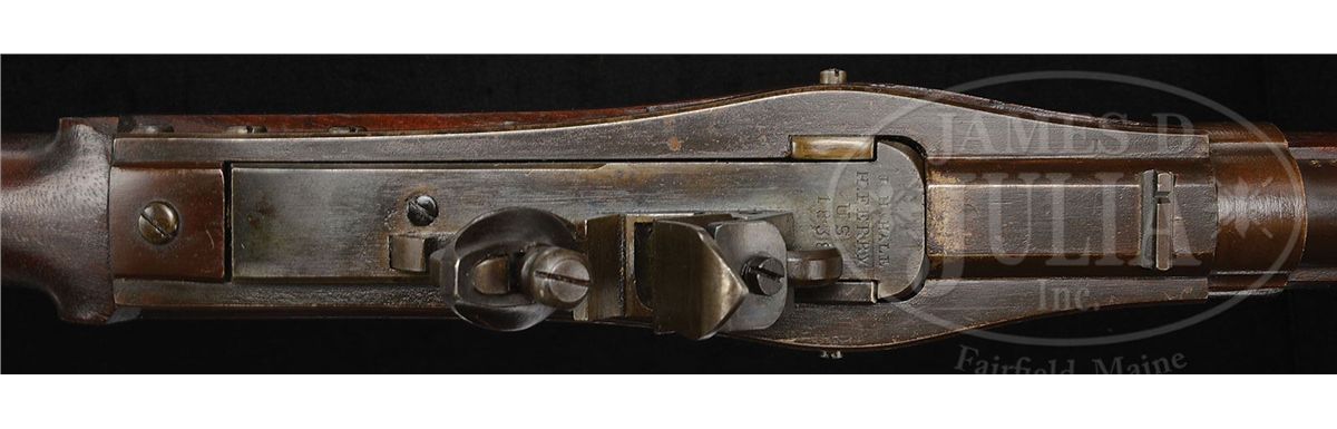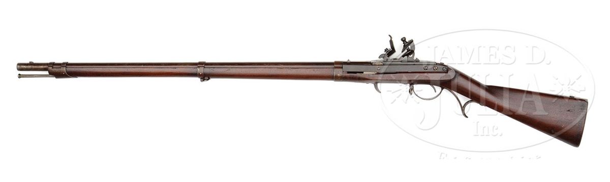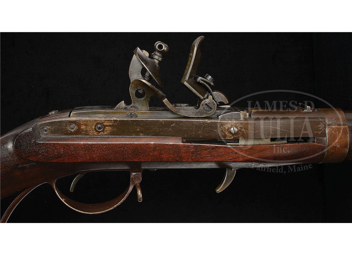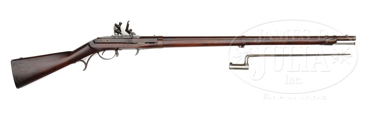 NSN. 54 Cal. x 32-5/8" Browned round bbl with 16-groove rifling that extends to 1-1/2" from muzzle. Offset front sight setback 1-1/4" from muzzle corresponding rear sight 2" in front of breech and marked "PP" in front of rear bbl band. Receiver is also browned and stamped "J. H. Hall" / "H Ferry", and "US / 1838". Iron furniture is also browned. Gun is complete with it's org bright ramrod. Oil finished walnut stock is unmarked except for "IG" deeply stamped behind trigger guard. Accompanying this rifle is it's org matching condition bayonet with 16" long unmarked blade. PROVENANCE: See Guide to American Antique Firearms and Their Values, 1998, by Flayderman. Collection of Dr. Douglas Sirkin. CONDITION: Fine condition. Bbl and action retain 70% orig brown, showing handling wear on top of bbl and around muzzle from contact with bayonet. Breechblock retains nearly all its orig case hardened fading color, and furniture has most of its orig brown. Stock is fine, retaining most of its orig oil finish. 1/2" by 1/8" chip left forend. 1/4" by 1/8" wide dent behind right rear supporter and a 1/4" wide by 1/4" chip directly behind left supporter. Remainder of stock is fine with only minor handling scratches. Bore is excellent, as is mechanism. Appears unfired, with only a very few marks on frizzen. 4-49964 PAS1