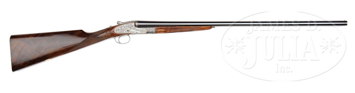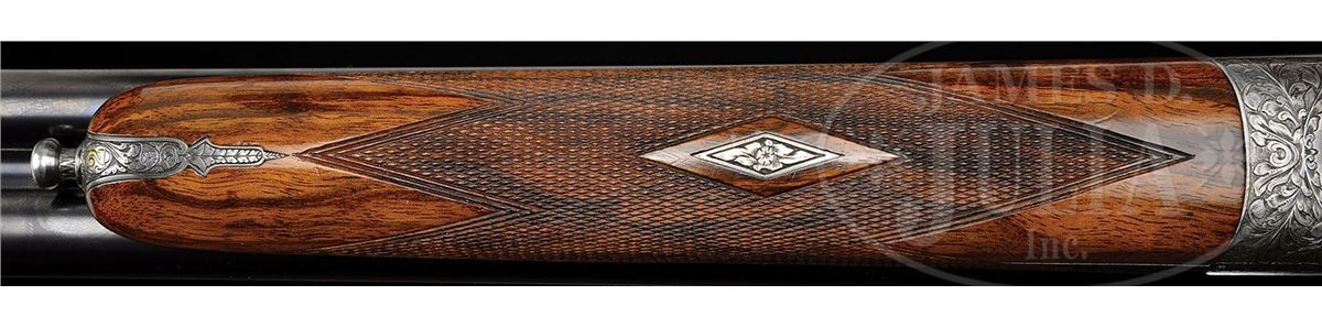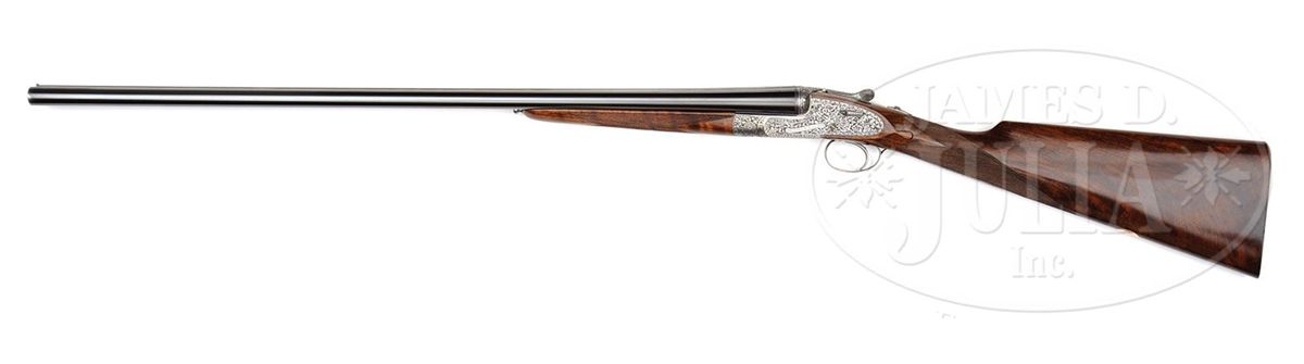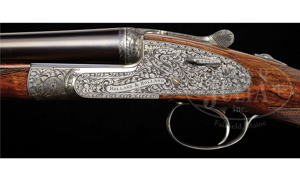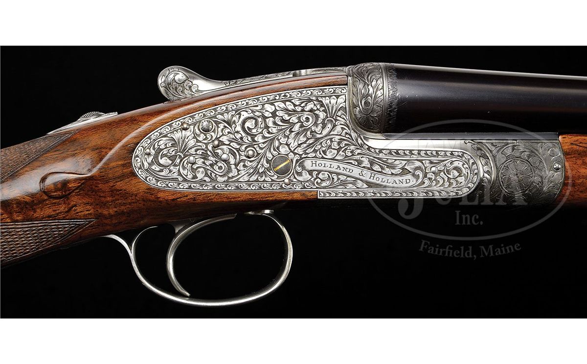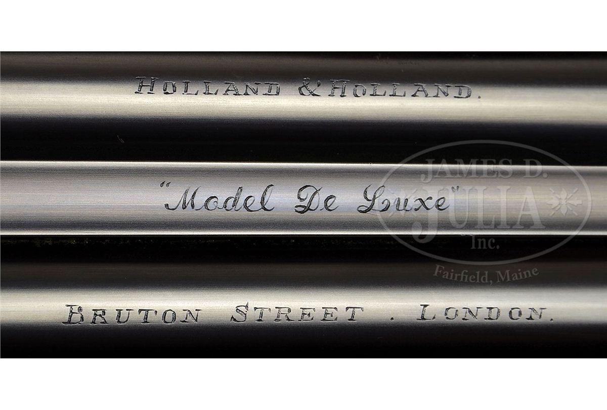 SN 41315. (1997) Cal. 20 ga. 2-3/4" Chambers. 28" Beautifully struck chopper lump bbls are engraved "Holland & Holland" and "Bruton Street. London." on tops. Rear portion of concave game rib is engraved "Model Deluxe". Gun is no. "2" of a pair (number "1" is also in this auction) with "2" gold inlaid on rear of rib, top lever, and forend tip. Bbl flats are stamped with 1997 London nitro proofs. Bottom of rear lump is stamped "H & H NY. NY." Bottoms of bbls are stamped with SN, and fitted with self-opening assist spring. Small coin finished action is nicely filed and features automatic safety (SAFE inlaid in gold), single non-selective trigger, gold band tumbler end cocking indicators, and hand detachable sidelocks. Action and lockplates are engraved with exceptionally well cut, large, shaded, open, scrolled acanthus with strapwork highlights within foliate borders. "Holland & Holland" is in large, scrolled riband on each lockplate. Bottom of action is engraved "Model Deluxe". Small bow single beaded trigger guard is also scroll engraved, and has SN gold inlaid at grip. Well marbled, and nicely figured, flesh-toned European walnut straight grip buttstock measures 14-5/8" over traditional checkered wood butt, and features diamond grip with point pattern checkering and mullered borders, drop points, and a gold oval on toe line engraved "J. W. H". Matching splinter ejector forend has Anson release. Bore diameter: left-.610, right -.610. Bore restrictions: left -.011 (Lt mod), right -.008 (IC). Wall thickness: left -.036, right -.035. Drop at heel: 2", drop at comb: 1-1/4". Weight: 5 lbs. 10 oz. LOP: 14-5/8". Gun is accompanied by 1920's vintage leather two gun motor case with stitched leather corners, lined in green cloth, having black leather gold embossed H & H label in lid, along with gun cleaning information label, and charge card for gun no. "25741". Case contains black morocco wallet with pull through cleaning kit, round H & H marked oil bottle, and a pair of H & H marked snap caps, in covered compartment. Another compartment contains horn handled H & H marked turnscrew. CONDITION: Excellent, showing slight use. Bbls retain 98% orig blue with silvering at muzzles and breech ends, and a few very light marks. Action retains essentially all of its coin finish. Stocks have a few light scratches. There are two somewhat deeper compressions on right side of butt. Bores are excellent. Mechanically crisp. Case leather is darkening, with a few scuffs on edges and corners, some grain lifting. One strap is broken, handle is good. Interior cloth is fine with compressions and areas rubbed through from contact with bbls. Labels are excellent. Paper labels are slightly foxed and soiled. Turnscrew is fine. Other accessories are "as new". 4-49114 MGM309